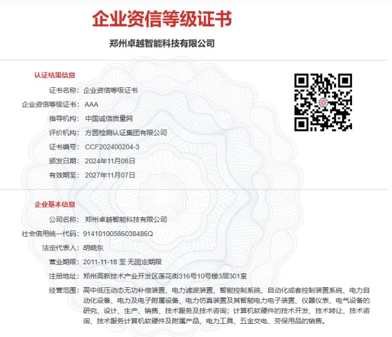 郑州卓越智能科技有限公司成立于2011年,坐落于郑州市高新技术产业开发区电子电器产业园中,占地2000多平方米,现有员工50余人,是一家专业从事电力系统自动化设备和电能质量治理设备的研发、生产、销售和服务。