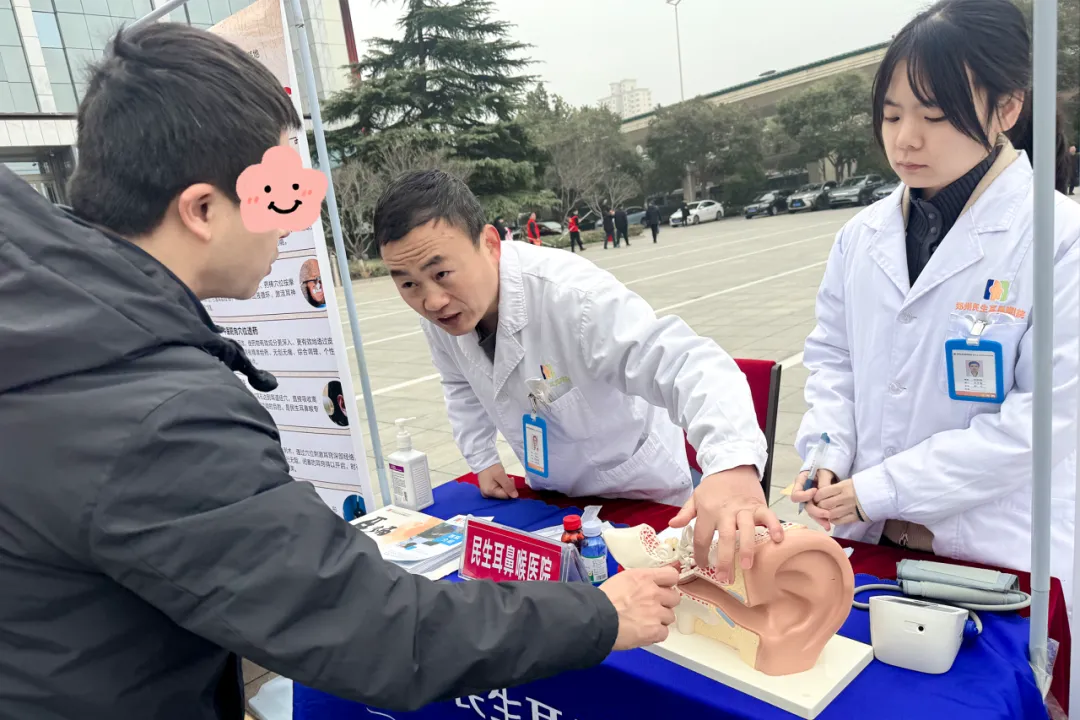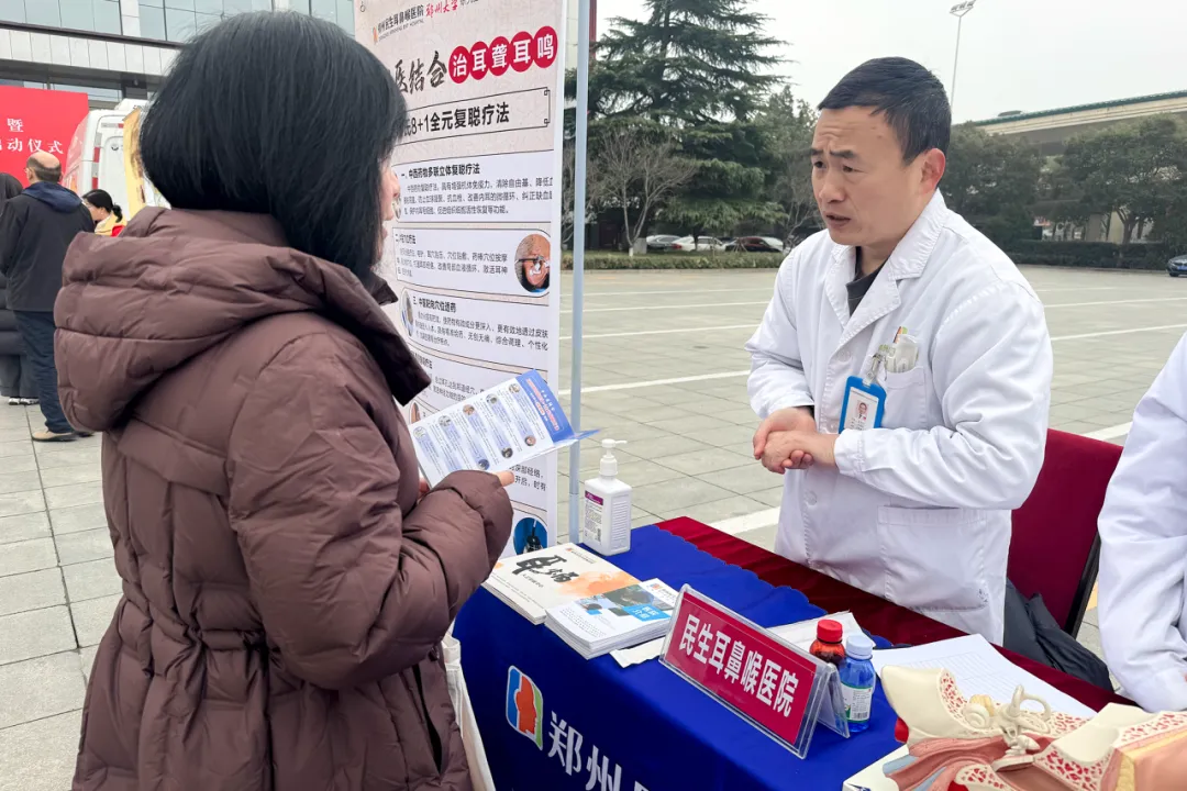 活动现场,郑州民生耳鼻喉医院由王元兴医生带领医护团队开展志愿服务,为前来咨询的群众提供耳鼻咽喉健康咨询、耳部相关检查及血压测量等公益服务,并针对耳鸣、听力下降等常见问题进行专业讲解,提醒大家科学护耳、及时就医。
