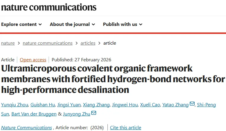 论文DOI :10.1038/s41467-026-69779-1全球水资源短缺问题日益严峻,反渗透(RO)技术作为主流的海水淡化手段,其核心聚酰胺复合膜由于缺乏有序的纳米结构和均一的孔径,难以突破渗透性与选择性之间的“权衡效应”。共价有机框架(COFs)因其有序的孔道、均一的孔径和高孔隙率,成为下一代分离膜的理想材料。然而,COF固有的孔径(0.8–5 nm)远大于水合离子的尺寸(~0.72 nm),且其结晶度往往不足,导致其在低压RO海水淡化中的应用面临巨大挑战。现有孔径调控策略(如化学修饰或堆积工程)常因增加位阻而干扰反应动力学,导致结晶度下降,进而影响分离性能。氢键在调控COF结构和功能中发挥着关键作用,通过在框架中引入氢键给体或受体,可增强层内和层间相互作用,从而优化孔道几何结构、提高结构有序性。特别是β-酮烯胺结构,其形成的丰富氢键网络能在保证结构完整性的同时提高结晶度,有望解决COF膜的稳定性与结晶度之间的矛盾。基于此,本文提出一种氢键强化策略,通过将1,3,5-三甲酰基苯(TFB)替换为具有酚羟基的1,3,5-三甲酰基间苯三酚(Tp),使其与苯-1,3,5-三碳酰肼(Bth)反应,形成具有丰富氢键网络的β-酮烯胺结构,从而调控COF的堆积模式(从AA堆积转变为AB堆积),获得更小、更均一的超微孔道(0.64 nm),以实现高效的海水淡化。研究内容: