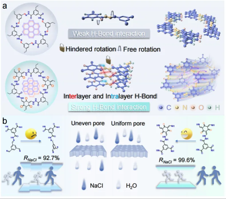 Fig. 1. Demonstrating hydrogen-bond regulated dual-configurational COF membranes. a, Schematic explanation of the hydrogen-bond-regulated strategy. b, Left panel: Schematic illustration of NaCl rejection by the imine-linked TFB-Bth COF membrane with low rotational energy barriers. Right panel: Schematic illustration of NaCl rejection by the β-ketoenamine-linked Tp-Bth COF membrane with high rotational energy barriers.