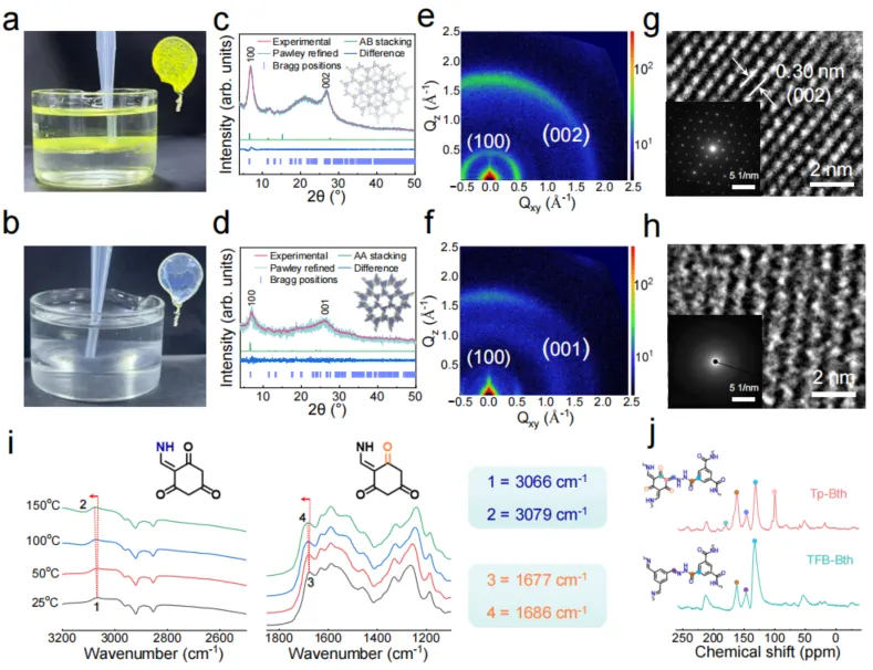 Fig. 2. Structural and functional characterization of free-standing COF nanofilms. The Optical photograph of the freestanding film at the free two-phase interface (Image of the film captured by a wire loop), experimental, Pawley refined, and simulated PXRD profiles of the Tp-Bth film with difference (Rwp = 5.83% and Rp = 4.29%) and the TFB-Bth film with difference (Rwp = 16.74% and Rp = 12.9%), GIWAXS data, and HRTEM image (the lower inset is SAED pattern) of Tp-Bth COF (a, c, e, g) and TFB-Bth COF (b, d, f, h). i, Variable temperature IR spectra of Tp-Bth COF nanofilm; (j) Solid-state 13C NMR spectrum of Tp-Bth COF (top) and TFB-Bth COF (bottom) (400 MHz).