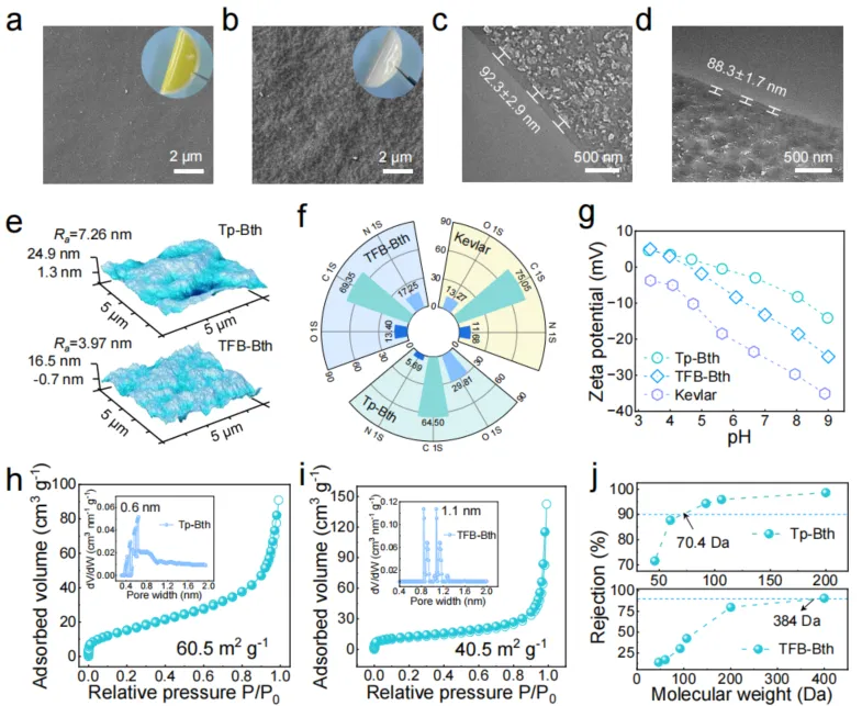 Fig. 3. Morphology characterization and physicochemical properties of the membranes. a-e, Surface SEM, Cross-sectional TEM, and AFM images of Tp-Bth (a, c) and TFB-Bth (b, d) COF membranes (insert: digital images of COF membranes with a diameter of 4.5 cm). f-g, XPS spectra and Zeta potentials of Kevlar, Tp-Bth, and TFB-Bth COF membranes. h-i, N2 adsorption-desorption isotherm and pore size distributions for the Tp-Bth and TFB-Bth nanofilms. j, The rejection performance of uncharged organic solutes (the feed concentration is 1000 ppm).