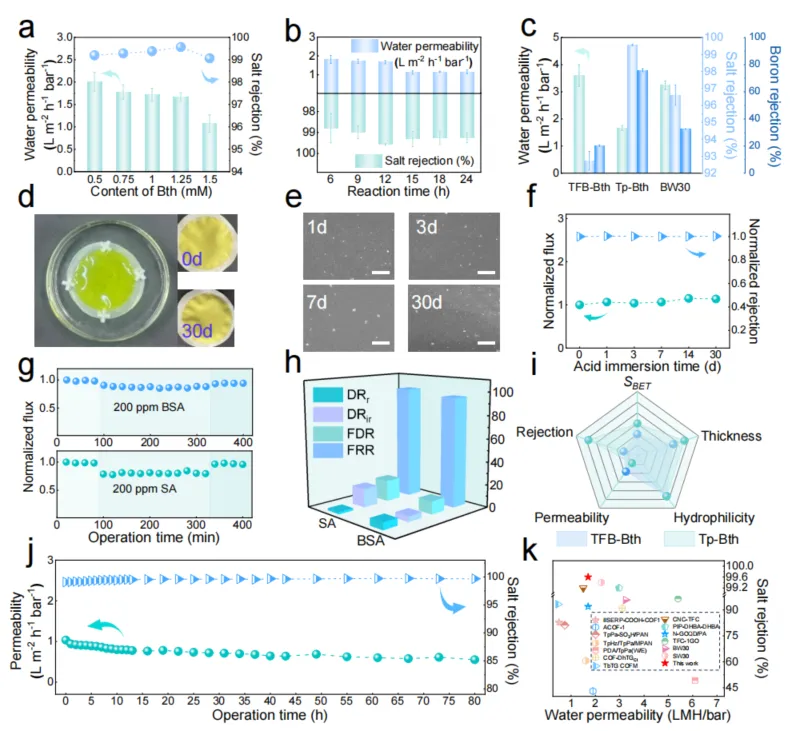 Fig. 4. Performance and application of Tp-Bth and TFB-Bth COF membranes. a-b, Water permeance and NaCl rejection of Tp-Bth COF membranes under different Bth content and reaction time. c, Separation performance of the TFB-Bth, Tp-Bth, and SW30 membranes toward a 2000 ppm NaCl and 5 ppm boron feed solution. d-e, Digital photographs, SEM images (scale bar 1 μm) of Tp-Bth membrane acid immersion process. f, Performance of the long-term pH stability (pH = 3) of the Tp-Bth membrane at a feed pressure of 15 bar and room temperature (2000 ppm NaCl). g, Evaluation of antifouling performance: Normalized water flux versus operation time for Tp-Bth COF membrane using BSA and SA as model foulants. The fouling tests comprise three stages: (1) collecting baseline of water flux using a feed solution of 2,000 ppm NaCl, (2) recording flux when fouled by 200 ppm model foulants in a feed solution of 2,000 ppm NaCl and (3) evaluating flux recovery using a feed solution of 2,000 ppm NaCl after cleaning the membrane via deionized water flushing. h, flux recovery ratio (FRR), flux decline Ratio (FDR), reversible flux decline rate (DRr) and irreversible flux decline rate (DRir) for Tp-Bth COF membrane. i, Radar plot comparing the physicochemical properties of Tp-Bth and TFB-Bth COF membranes. j, Long-term operational stability performance of Tp-Bth membrane. k, Membranes performance in this work compared to other membranes in the literature. Data are presented as mean ± SD (n=3 for Fig. 4a-c).