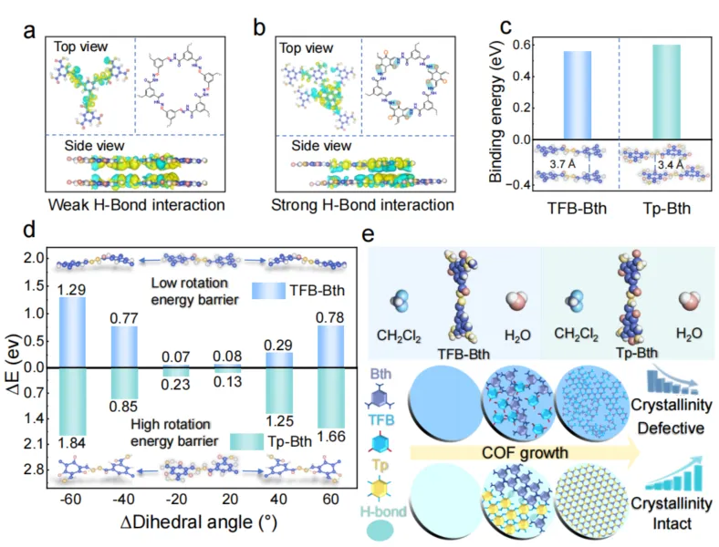 Fig. 5. Mechanistic insights into hydrogen bond formation and performance enhancement. a, Differential charge density of TFB-Bth COF. b, Differential charge density of Tp-Bth COF (blue, decrease in electron density; yellow, increase in electron density). c, DFT calculation of the interlayer binding energy of TFB-Bth COF and Tp-Bth COF. d, DFT analysis of torsional energy barriers in single-layer covalent organic frameworks (COFs), with dihedral angles referenced to the central N-N bond within the molecular framework. Both TFB-Bth and Tp-Bth systems exhibit initial torsion angles of -60 °. The horizontal axis represents the torsional angle variation spanning from -60 ° (minimum) to 60 ° (maximum). The figure illustrates the molecular conformations at dihedral angles of -60 °, 0 °, and 60 °. e, Interaction energy obtained from DFT calculations and the growth of the COF membranes.