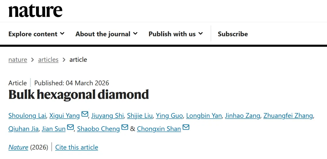 近日,郑州大学金刚石材料与器件团队成功合成出纯相六方金刚石块材,并精确解析了其晶体结构,揭示了全新的相变机制。相关研究成果以“Bulk hexagonal diamond”为题,于北京时间2026年3月5日在线发表在国际学术期刊《自然》(Nature)上。郑州大学物理学院博士研究生来守龙、杨西贵教授和南京大学施九洋博士为该论文共同第一作者,郑州大学单崇新教授、杨西贵教授、程少博教授以及南京大学孙建教授为论文共同通讯作者,郑州大学为第一完成单位和通讯作者单位。