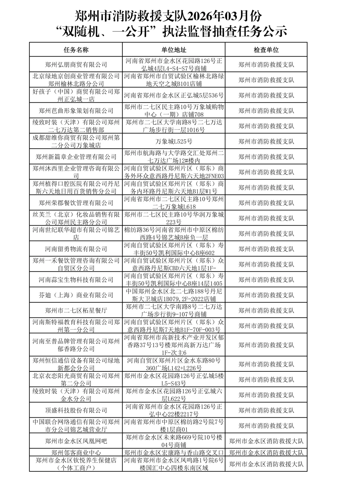郑州市消防救援支队2026年03月份“双随机、一公开”执法监督抽查任务公示