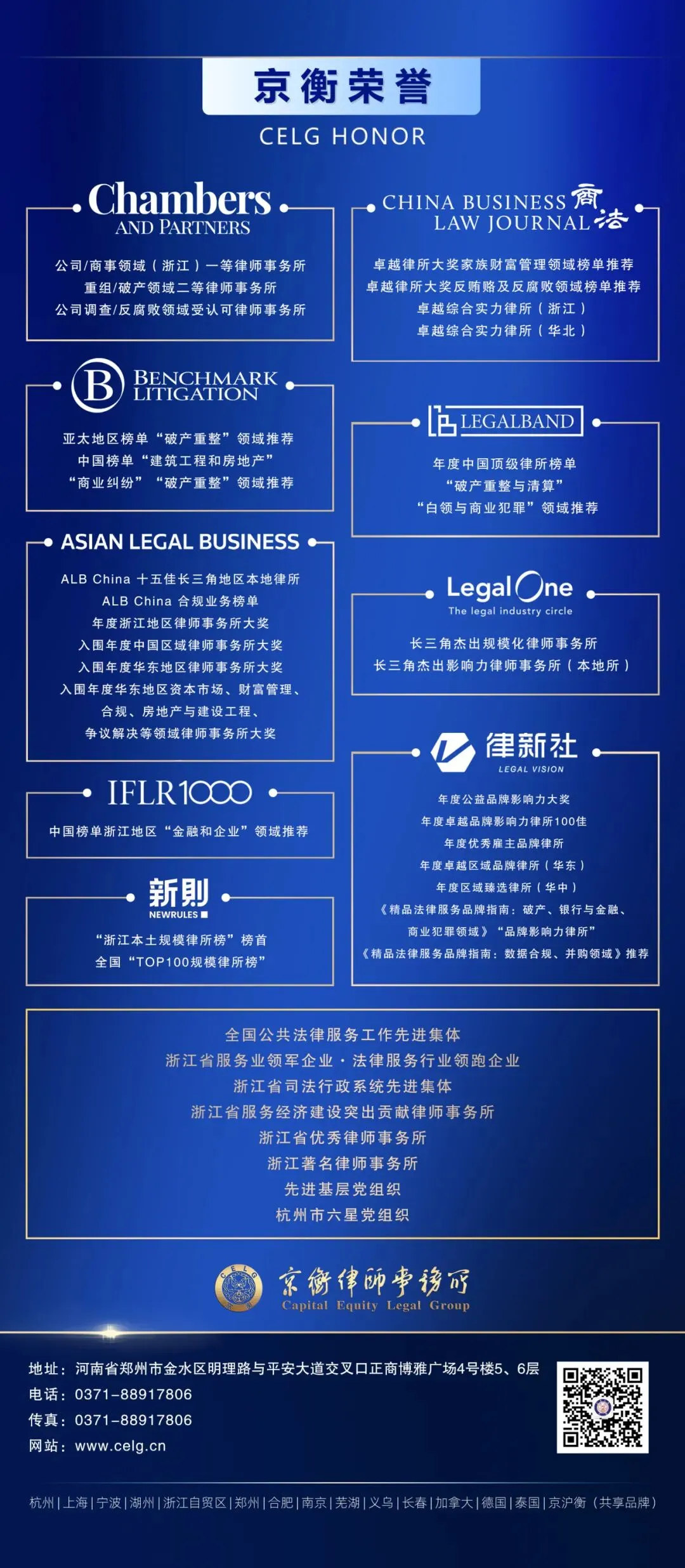 2023年,京衡郑州所获得司法部授予的“全国公共法律服务工作先进集体”荣誉称号,律所党支部获得“全省律师行业先进基层党组织”荣誉称号。凭借业务领域的出色表现,京衡郑州所被《商法》月刊评为卓越综合实力律所(华北),被律新社评为“律新社2024年度区域臻选律所-华中”。