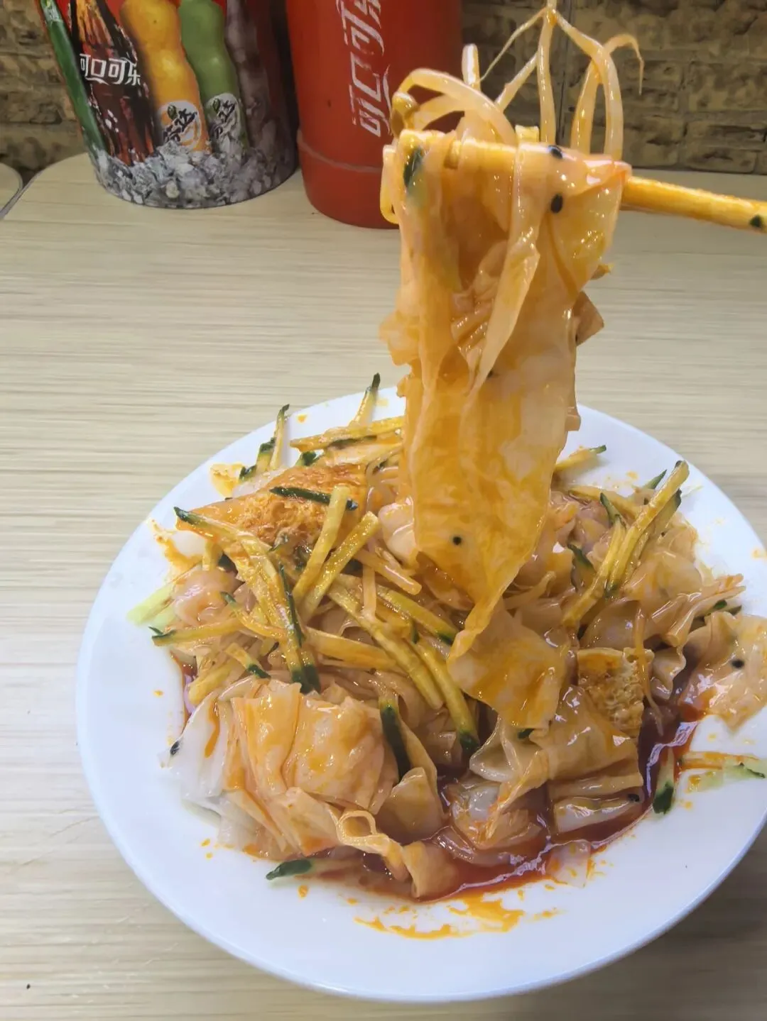 汝河路上一家卖米线的店,他家的手工凉皮薄如蝉翼,又不失筋道!