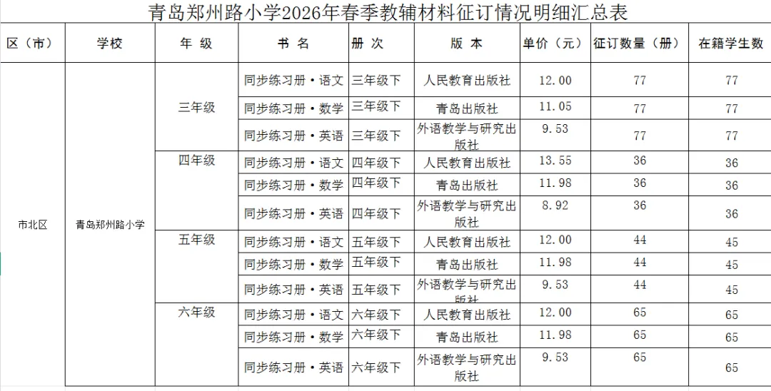 为规范做好教辅材料征订工作,我校严格执行省、市教育主管部门关于中小学教辅材料征订相关要求,严格落实“一科一辅”自愿征订原则,学生教辅材料通过山东评议教辅管理服务平台征订缴费,现将2026年春季教辅材料征订缴费情况予以公示,公示时间为2026年3月5日--2026年3月13日。