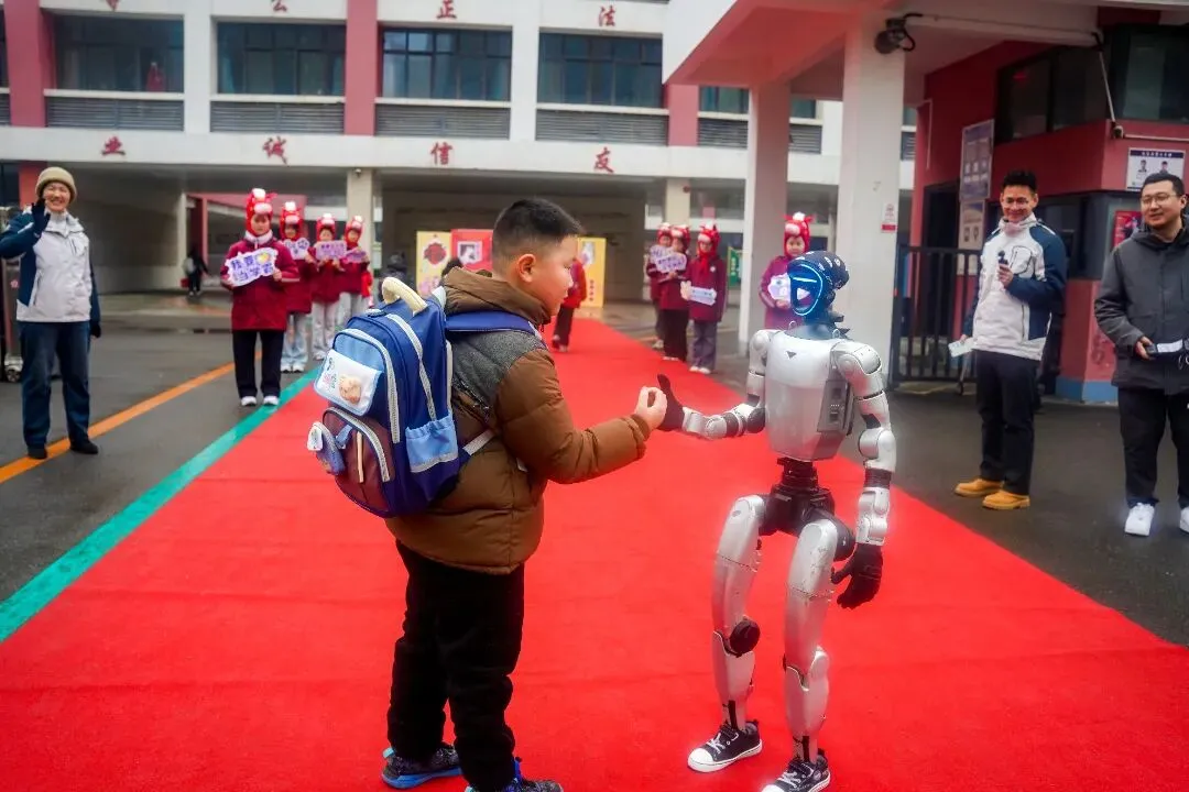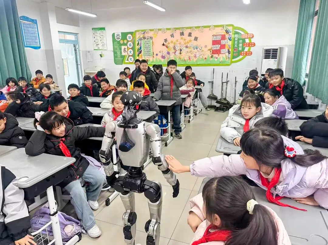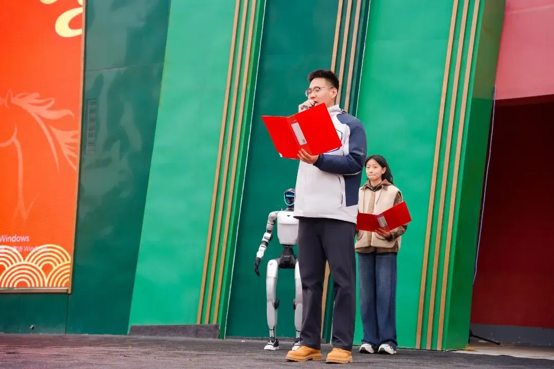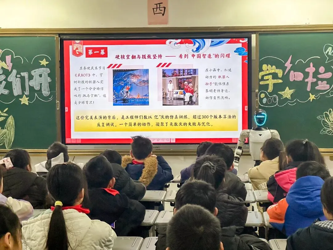 现场,一段春晚《武 BOT》视频率先点燃氛围 —— 机器人腾空翻、耍棍术的高难度动作,让同学们惊叹连连。更令人惊喜的是,主持人话音刚落,春晚同款机器人便闪亮登场!