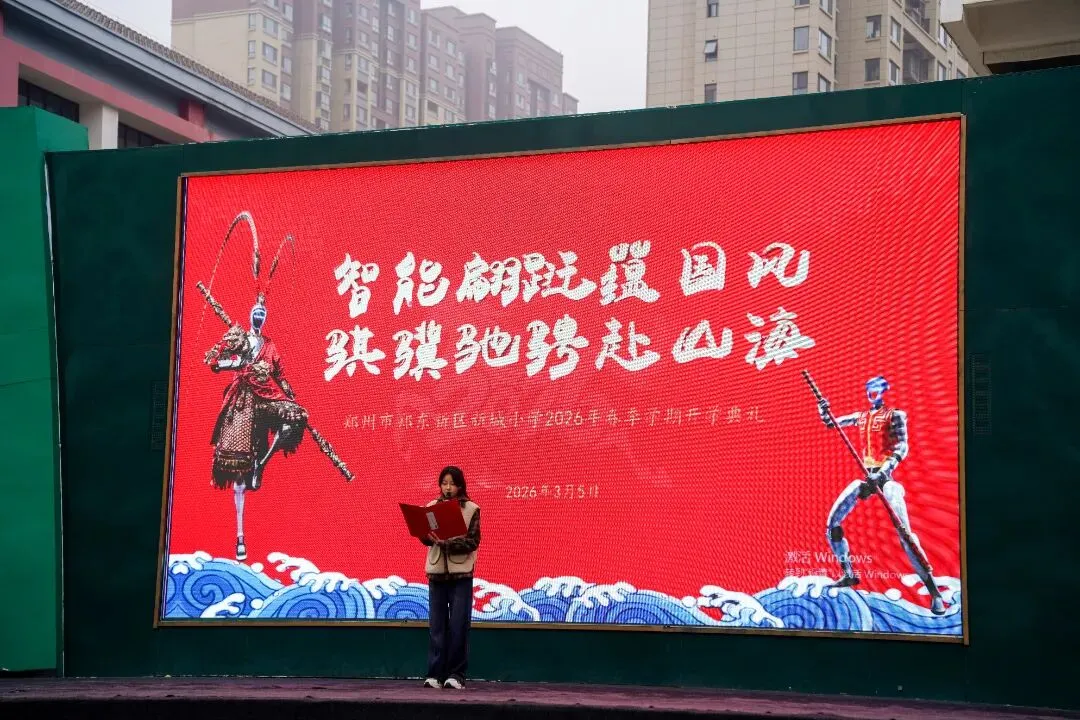 主持人落落大方走上舞台,站在大屏幕前,以饱满的精神状态宣布典礼正式开始。全体师生欢聚校园,在热烈掌声中开启新学期征程。