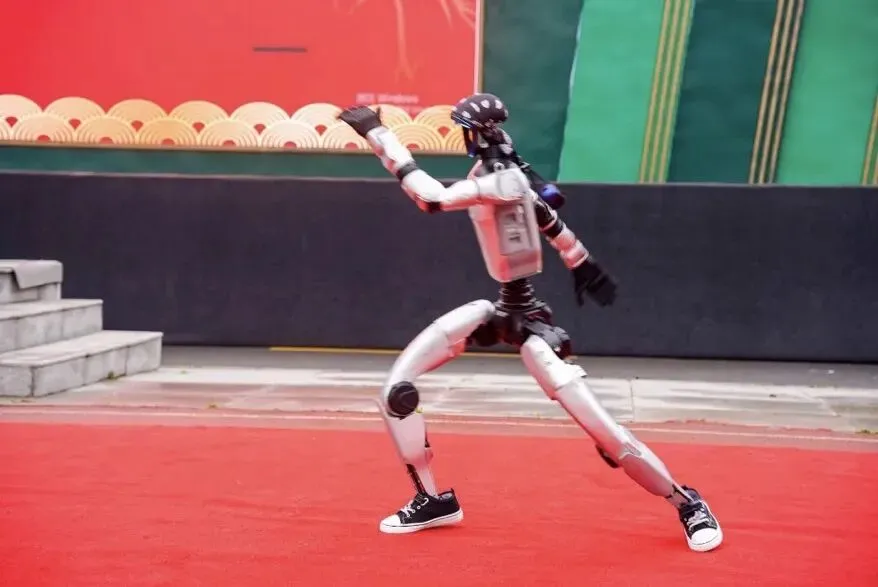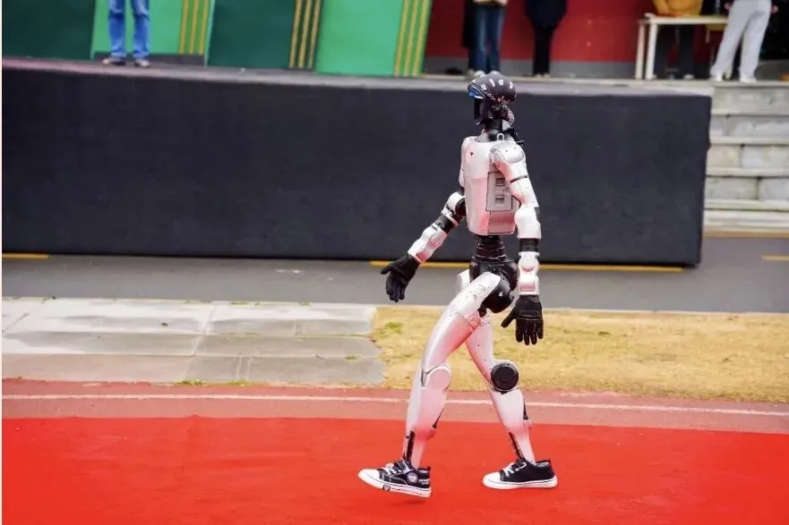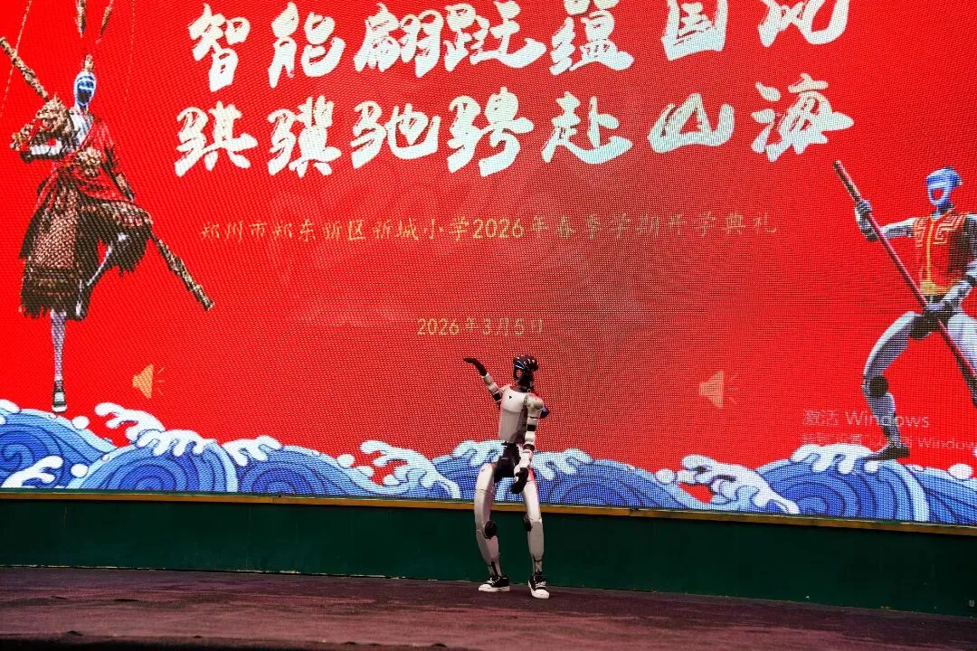 随后它走到操场中央,即刻开启精彩的武术表演。它动作精准利落、刚劲有力,出拳迅猛、踢腿沉稳,每一个招式都衔接流畅、规范标准,将武术的精气神展现得恰到好处。利落的姿态、连贯的动作,瞬间点燃全场氛围,赢得师生们阵阵欢呼与热烈掌声。