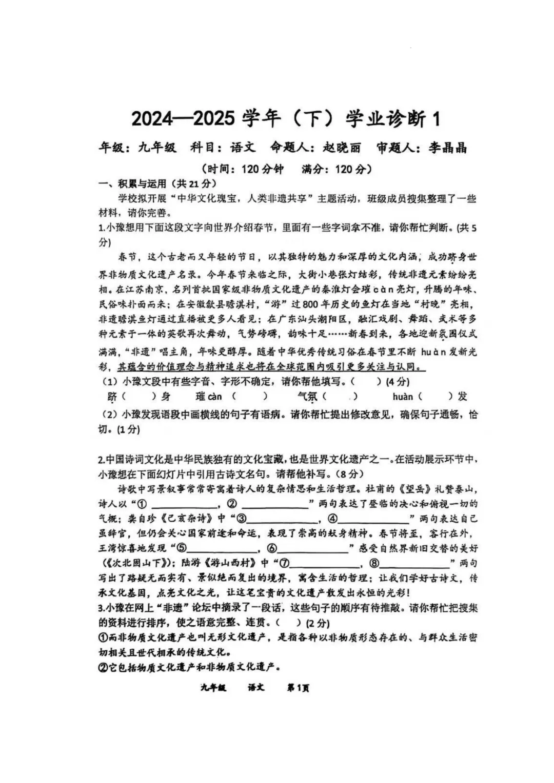 本试卷紧扣九年级语文课程标准,全面覆盖了字音字形、病句修改、名篇名句理解性默写、语段排序、新闻拟题、材料概括、文学性文本深度阅读、非连续性文本整合、文言文对比阅读、古诗比较鉴赏、名著整本书探究(简·爱与林冲)及话题作文等核心能力。基础题如字音字形是得分点;难点在于高阶思维与综合探究题目,如分析《有风的夜晚》的叙事艺术与人物心理、梳理多材料中传统文化数字化的措施、对比分析《醉翁亭记》与《欧阳修传》中的人物形象、探究名著人物的‘45°人生’,对学生的信息整合、批判性思维、文化传承与创意表达能力构成了系统性、高难度的挑战,区分度显著。<点击图片查看全卷>