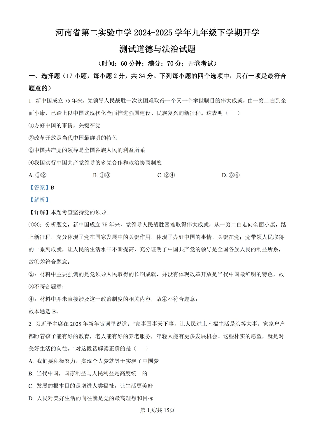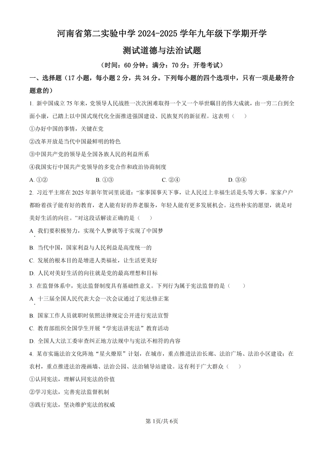 本试卷涵盖党的领导、宪法与法治、公民权利与义务、基本经济制度、科技创新、教育发展、民主政治、文化建设、生态保护、国家安全、国家统一、国际责任等九年级核心主干知识。基础题如概念辨析是得分点;难点在于非选择题中对复杂社会现象的分析论证(如‘柔性执法’的辩证评价、培育新质生产力的综合路径、乡村振兴的必要性与建设建议),对学生的信息整合、逻辑推理、价值判断与解决实际问题能力提出了较高挑战,充分体现了道德与法治学科的实践导向。<点击图片查看全卷>