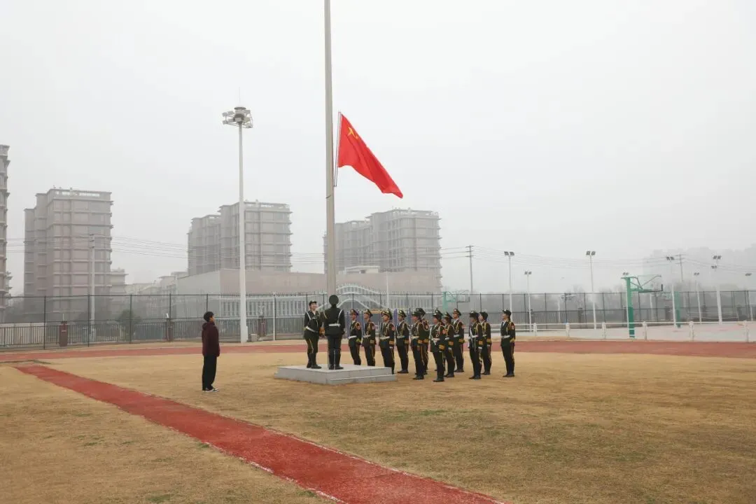 开学典礼在庄严的国歌声中拉开帷幕。全体师生肃立注目,鲜艳的五星红旗迎着春风冉冉升起,嘹亮的国歌响彻校园上空。