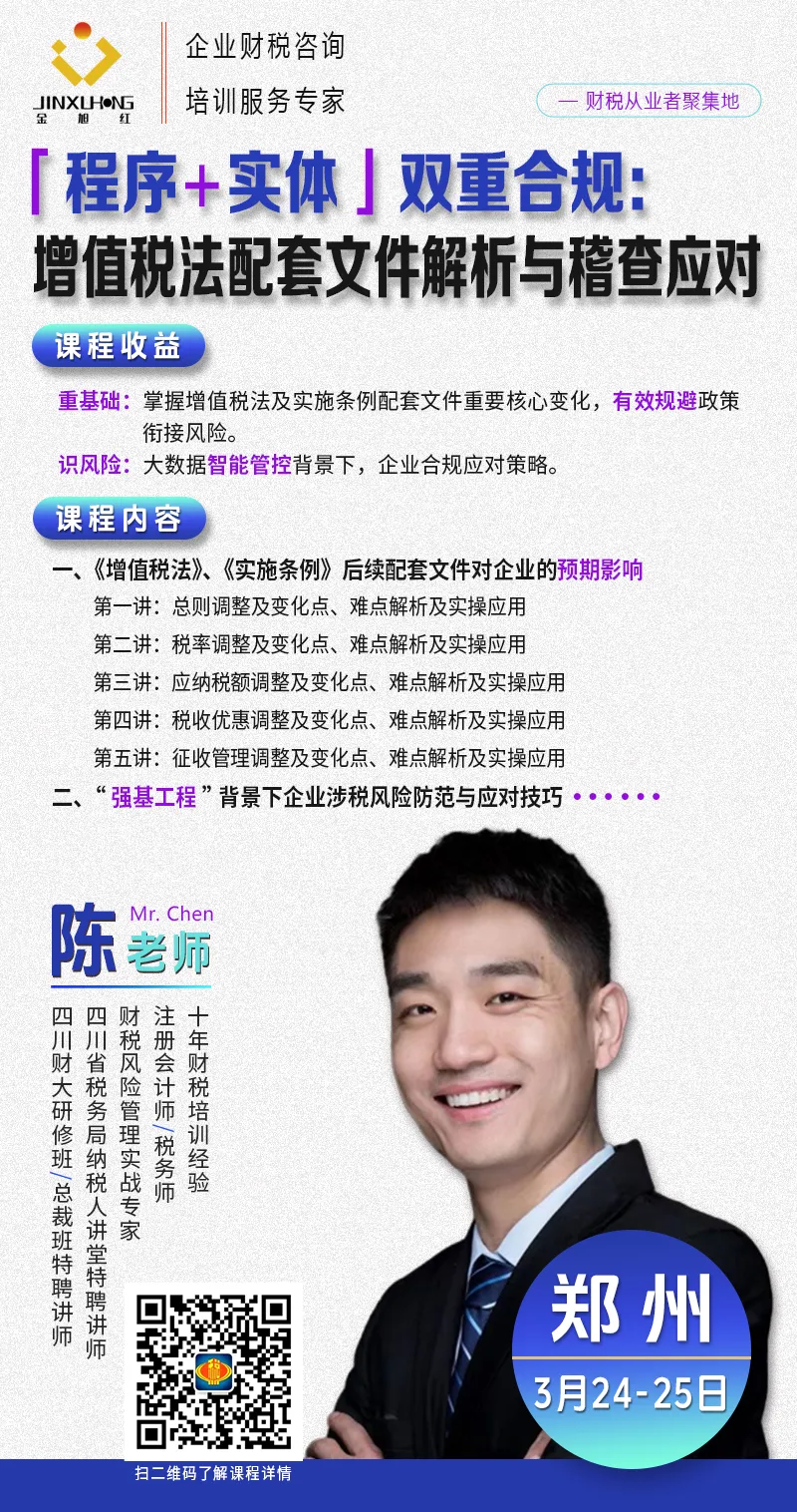 陈雷老师:财税风险管理实战专家,10年财税培训经验、注册会计师、税务师;四川省税务局纳税人讲堂特聘讲师、四川财大研修班、总裁班特聘讲师;陈雷老师对生产制造、房地产、建筑安装、工业、商业、服务业等行业均进行过专题调研与检查,具有熟练的业务技能;能够将晦涩难懂的税法知识与企业涉税实务巧妙对接,让学员在潜移默化中建立良好的税法思维,在规避涉税风险的同时创造财务价值。