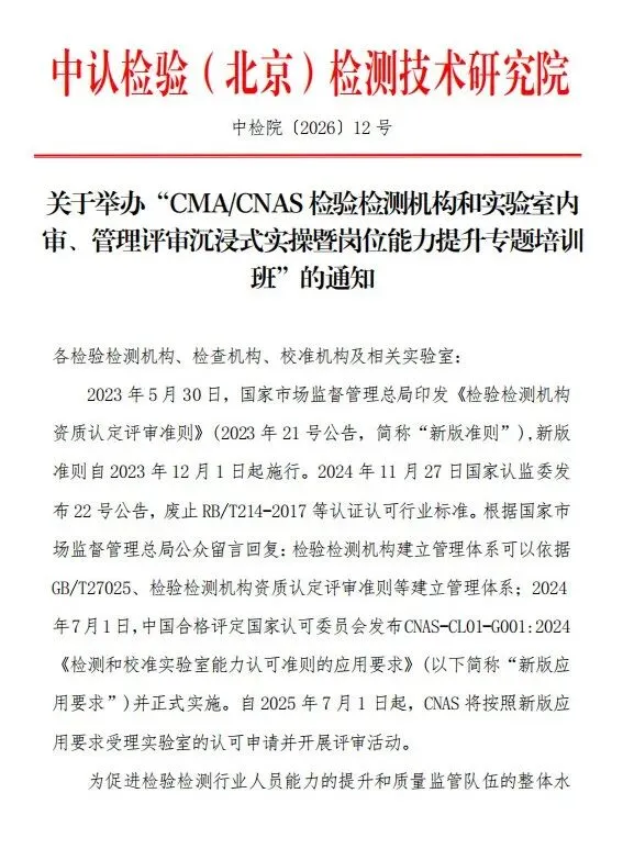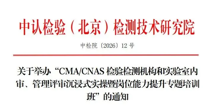 为帮助广大检验检测机构和实验室培养高素质内审队伍,及时掌握最新评审要求与实操方法,结合检验检测机构实际需求,中认检验(北京)检测技术研究院计划于2026年在全国范围举办“检验检测机构资质认定/认可内审员培训班”,(简称“内审员班”)。“内审员班”培训实施具体工作由中认检验(北京)检测技术研究院承担,现将培训有关事宜通知如下:
