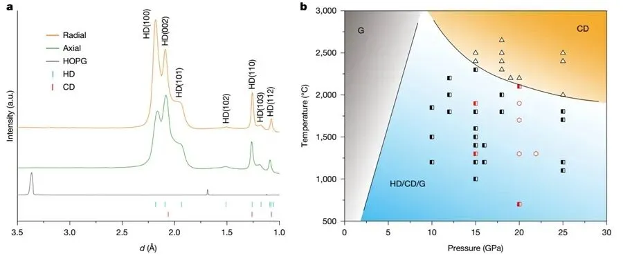 图1. X射线衍射图谱及压力-温度相图。图片来源:Nature