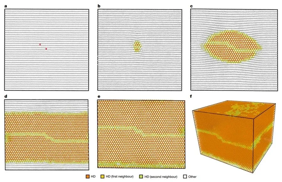 为揭示HOPG向六方金刚石的转变机制,作者采用基于GPU分子动力学(GPUMD)的神经等变势方法开展了大规模分子动力学模拟。模拟体系为边长10 nm的立方石墨模型,沿六方石墨[100]、[120]及[002]方向分别施加35、35和45 GPa的各向异性压力,并在1500 K温度下达到平衡。模拟结果表明,预先存在于石墨层间的共价键缺陷可作为优先成核位点,逐步演化为临界晶核,并最终形成纯度超过99%的六方金刚石相。层间共价键在此过程中发挥双重作用:一方面,其作为能量有利位点降低成核能垒,加速相变动力学过程;另一方面,通过抑制石墨层间的相对滑移,稳定ABAB堆垛序列,从而避免向立方金刚石等竞争相的转变。相比之下,完整单晶石墨因缺乏成核位点且能垒过高,其相变在动力学上难以实现;而无序石墨前驱体因层状结构褶皱,易发生层间滑移,最终生成的是立方金刚石而非六方相。上述模拟结果与实验观察到的微观结构特征及取向关系高度一致,证实了单轴应力与层间共价键在稳定六方堆垛结构中的决定性作用。