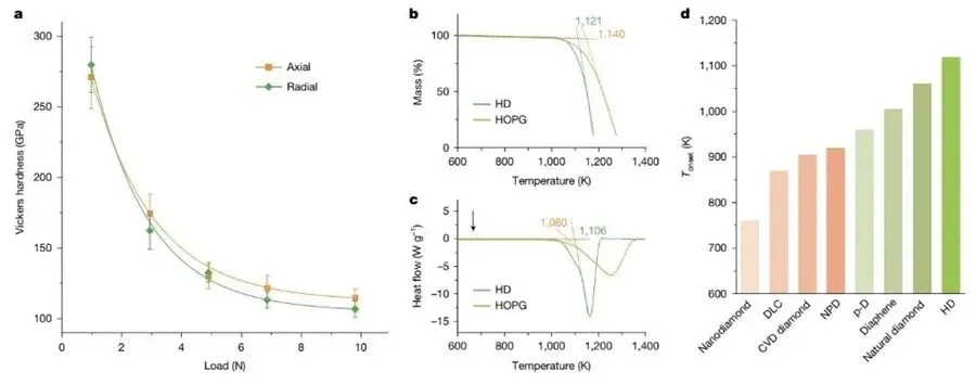 前文提到,理论预测表明六方金刚石可能具有超越立方金刚石的力学性能,是否果真如此,作者通过系统的力学测试进行了定量表征。在9.8 N载荷条件下,维氏硬度测试显示样品沿轴向和径向的硬度渐近值分别为114 ± 6.4 GPa和106 ± 5.7 GPa,与天然立方金刚石{110}晶面的硬度值(约110 GPa)基本相当。超声波测速进一步测得六方金刚石的杨氏模量为1229 ± 15 GPa,剪切模量为516 ± 18 GPa,显著高于单晶立方金刚石的对应数值(1087 ± 12 GPa和443 ± 8 GPa),证实了其更高的本征刚度。上述结果与采用Oliver-Pharr法的纳米压痕测试高度吻合,验证了力学性能测量的可靠性。另外,热稳定性测试显示,六方金刚石的氧化起始温度约为1121 K,高于天然金刚石及其他多晶金刚石材料,表现出优异的高温稳定性。