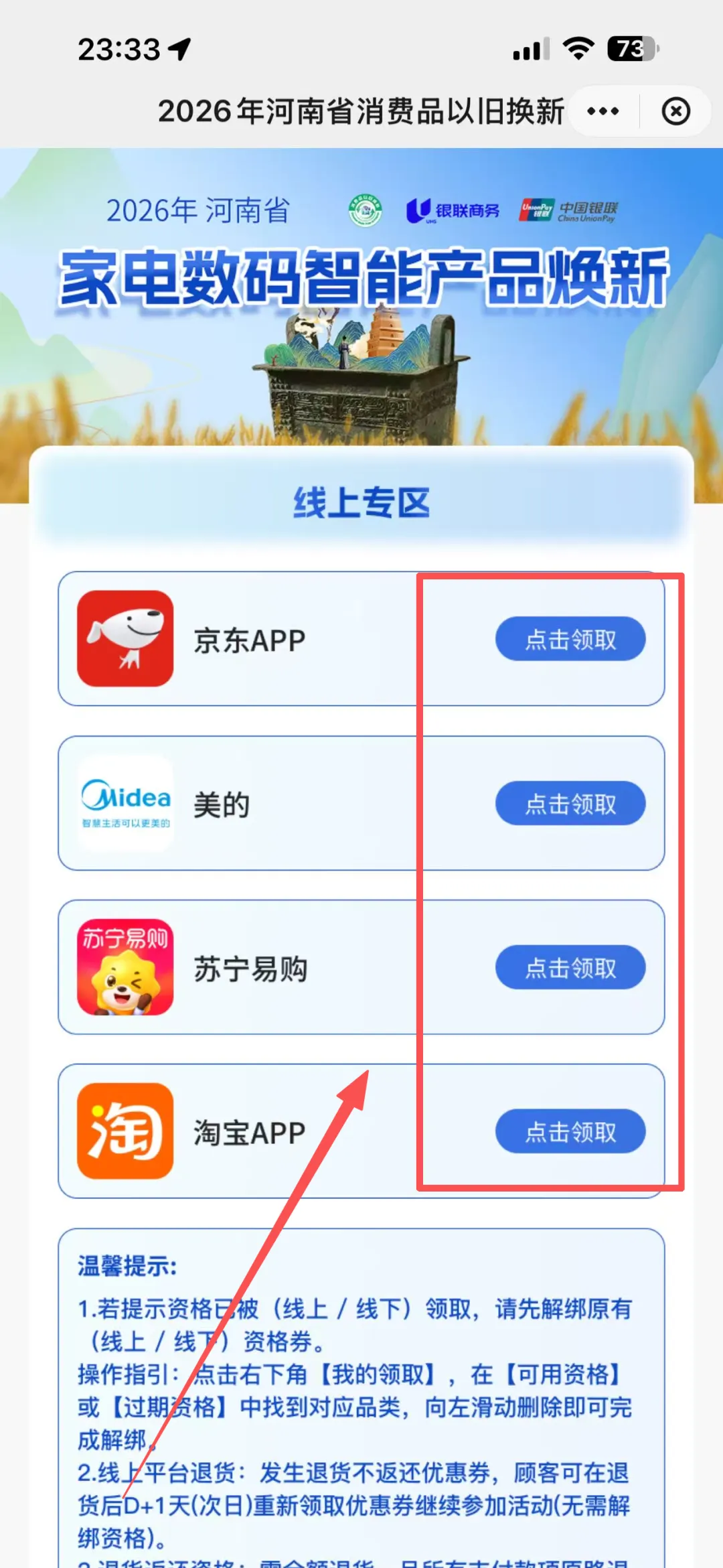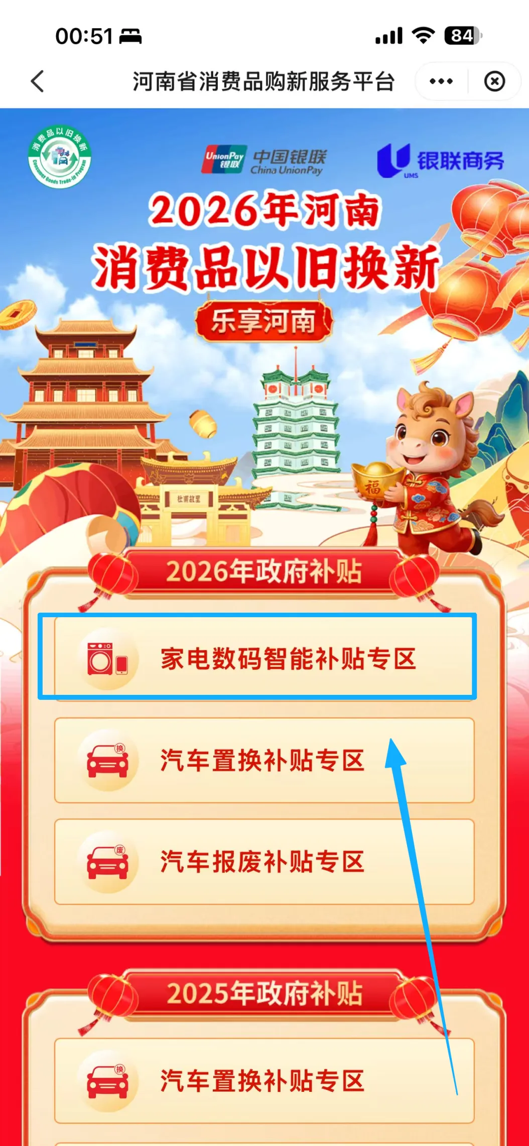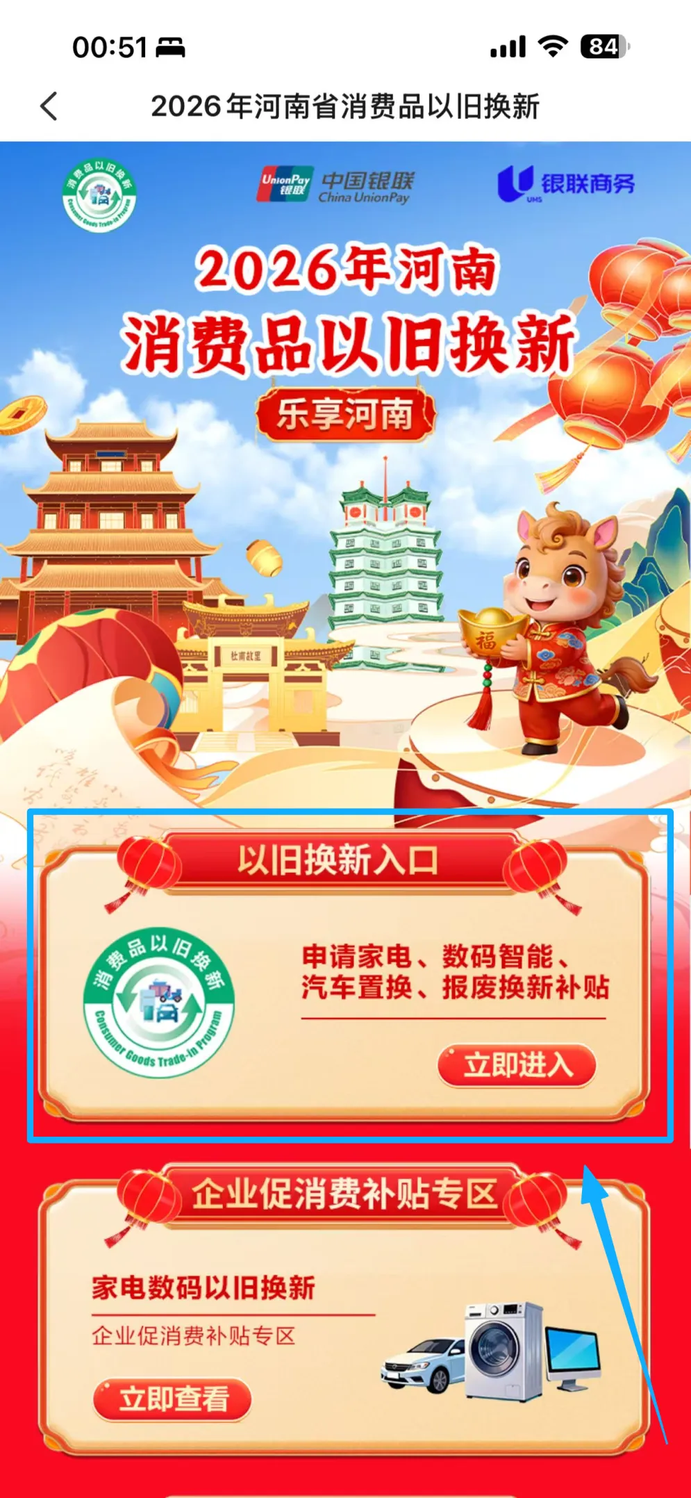 1️⃣首先从云闪付领取国补资格,进入云闪付后选择河南焕新,再点击以旧换新入口,选择家电数码智能补贴专区进入