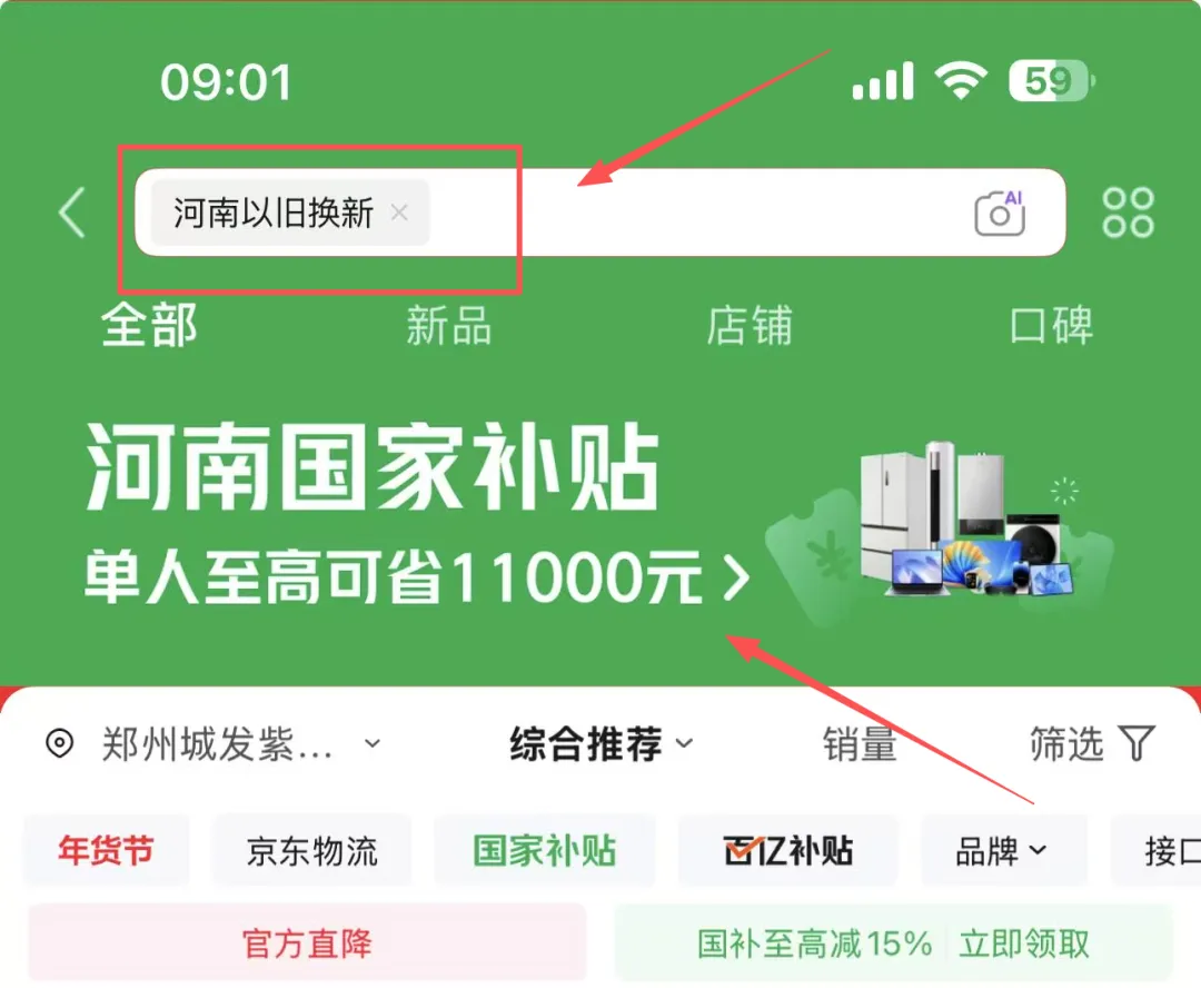 3️⃣以京东为例子,领取资格后,在京东app搜索“河南以旧换新”进入活动会场,选购心仪的产品,在购买时确认收货地址在河南