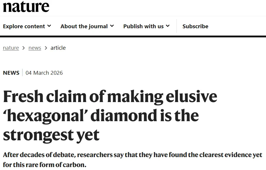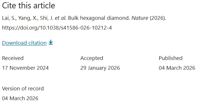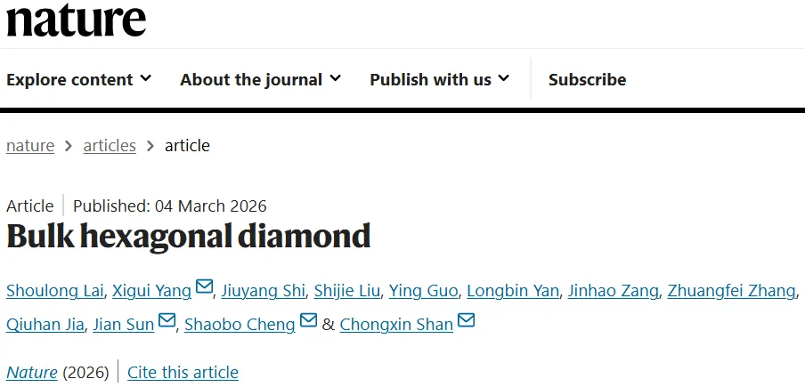 在最新一期的顶刊Nature上,郑州大学带来了一项重要成果,有意思的是该文章题目仅三个单词,下面我们来简单了解一下。3月4日,郑州大学的单崇新、杨西贵(共同一作兼共同通讯作者)、程少博与南京大学的孙建合作,作为共同通讯作者以“Bulk hexagonal diamond(块体六方金刚石)”为题发表了最新研究成果。立方金刚石(CD)被誉为"终极半导体",在科学界和工业界都引起了极大关注。其同质多象变体——六方金刚石(HD)则更为引人入胜,因为它与陨石撞击相关的迷人性质而备受关注。然而,由于缺乏确凿的实验证据证明其存在,六方金刚石的物理性质在很大程度上仍未被探索。该研究报道了从高度定向热解石墨(HOPG)沿c轴在高温高压下合成毫米级、纯相的六方金刚石。结合先进的结构表征和理论模拟,研究确认了六方金刚石的身份,并阐明了从石墨转变的机理。块体HD表现出略高于CD的硬度和高热稳定性。总之,该研究成功合成出了纯相六方金刚石块材,并精确解析了其晶体结构,揭示了全新的相变机制。这些发现也解决了六方金刚石作为独立碳相存在的长期争议,并为石墨-金刚石相变提供了新见解,为HD在未来先进技术应用中的研究和实际使用铺平了道路。据了解,该研究于2024年11月投稿,文章在一年多后的2026年1月底被正式接受,如今正式发表。值得一提的是,在同期《Nature》的杂志的“NEWS”栏目也对该研究进行了专门报道,发表了题为“Fresh claim of making elusive ‘hexagonal’ diamond is the strongest yet(最新宣称合成出罕见“六方金刚石”,证据力度迄今最强)”的评论文章。文章认为经过几十年的争论,研究人员表示他们发现了这种稀有碳结构的最清晰证据……本文的第一完成单位为郑州大学,共同第一作者为郑州大学来守龙、杨西贵和南京大学施九洋。这也是郑州大学今年以第一单位发表的首篇CNS正刊,可能也是该校历史上首篇一单位Nature文章(今年以共同通讯作者的身份已参与发表Nature)。文章最后通讯作者为单崇新,他生于1977年,河南长垣人,他1999年本科毕业于武汉大学,2004年博士毕业于中国科学院长春光学精密机械与物理研究所。博士毕业后他先后在香港中文大学和英国诺丁汉大学进行博士后研究,2008年他回国先是加入了中国科学院长春光学精密机械与物理研究所工作数年。2015年他又加入郑州大学工作至今,他目前为郑州大学CJ学者特聘教授,副校长。单崇新主要从事金刚石光电材料与器件研究,并在相关领域取得了突出成果,他目前为郑州大学金刚石光电材料与器件团队负责人。他曾获国家杰出青年基金、中国青年科技奖、中原学者和河南省自然科学一等奖等荣誉。
