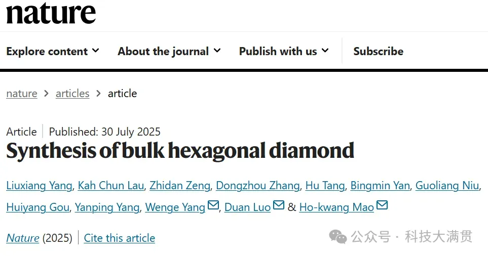 首篇!郑州大学以“Bulk hexagonal diamond”为题在顶刊Nature发表最新重要成果