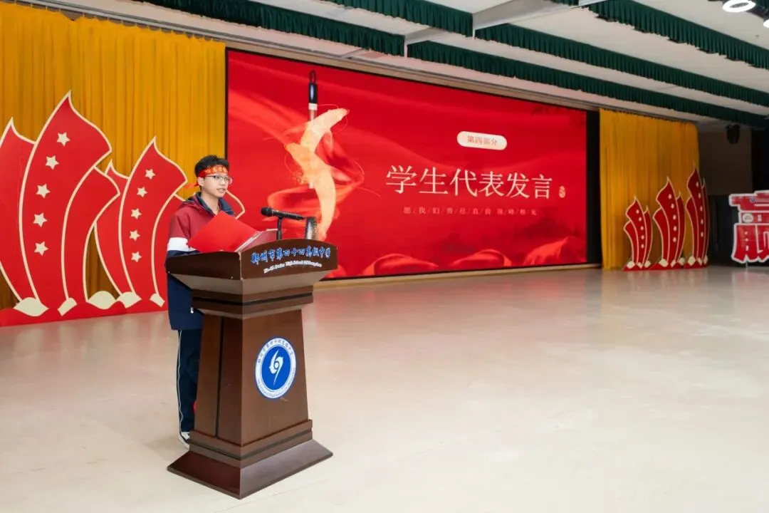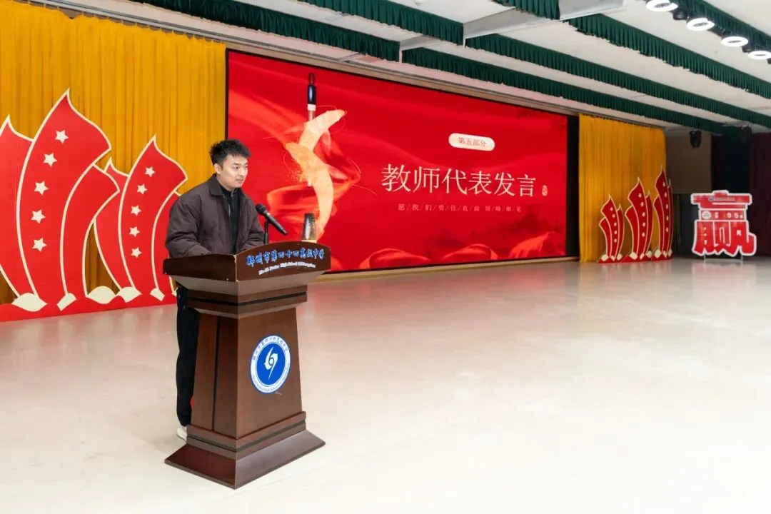 “看着视频里的一幕幕,看着在座的每一位同学,作为陪伴大家一路走来的班主任,我深知这段时光里的每一份坚持与不易。”班主任代表夏伟锋老师以自己经历为切入点,与学子们共情当下的心情。他向同学们提出三点期许,希望大家收心归位,以沉稳定力锚定前行方向;拿出拼搏劲头,以无畏勇气直面挑战;坚守坚韧意志,以不懈坚持跨越每一个难关。“夏伟锋老师的话,说出了我们所有老师的心声。”历史教师冯持以轻松亲切的话语,从“成长”的角度与学子们畅谈当下的意义,冯持老师结合自身生活小故事与往届学子的成长经历,告诉同学们当下的每一分努力都有价值,专注、坚持与直面困难的勇气,才是青春最耀眼的勋章。她还为同学们送上实用建议,希望大家做时间的主人、坚持科学规划、努力超越昨天的自己。两位老师的话语,满是陪伴的温情与前行的期许,让全体学子感受到了老师们一路同行的坚定力量,更收获了直面前路的勇气。