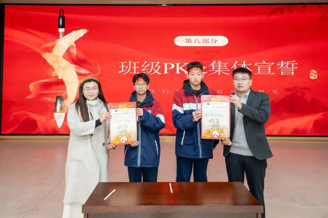 典礼的最后,班级PK、合唱环节将现场氛围推向高潮。各班级之间踊跃展开挑战,围绕早读状态、自习专注度、作业完成率等方面郑重递交“应战书”,尽显不服输的青春朝气。随后,全体师生共同合唱《我相信》,激昂的旋律、振奋的歌词,让满满的信心与力量在每个人心中传递。