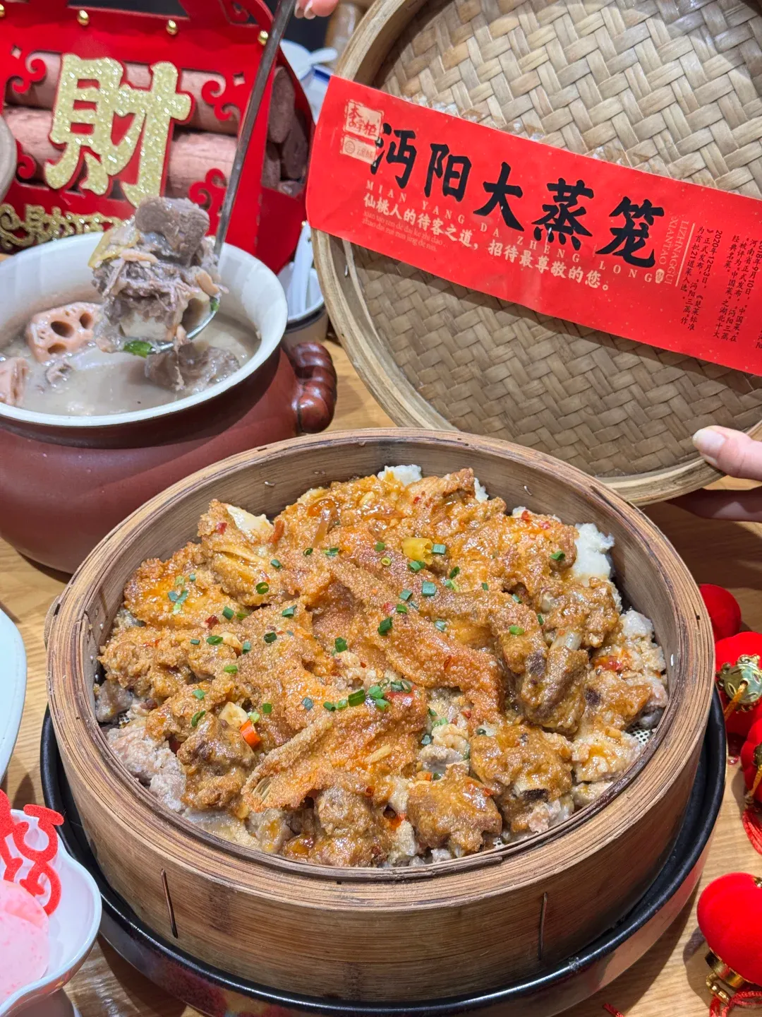 我打车去了老城区的一家「沔阳三蒸老店」(人均50元)。没有精致的招牌,门口直接架着几口巨大的铁锅,半人高的竹笼屉层层叠叠。水沸腾的咕噜声在街道上回荡,掀开笼盖的瞬间,巨大的白雾扑面而来。