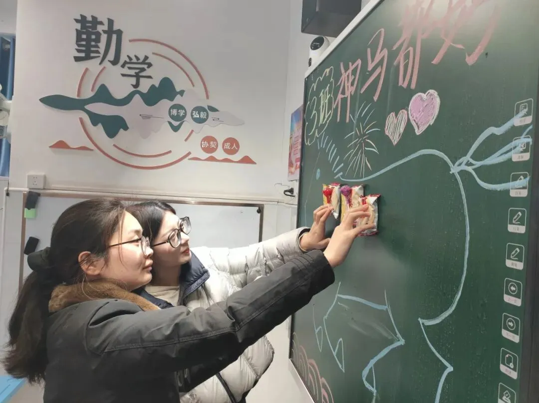 学校教室里悄然出现了一道道亮丽的风景线。正副班主任别出心裁,用旺仔饼干、棒棒糖等零食装点教室,将满满的祝福藏在每一处细节里,静待学子归来。高一(3)班班主任赵梦怡说到,“旺仔寓意‘好运旺旺’,我希望孩子们新学期学业旺、身体旺、心情也旺。”隔壁的高一(2)班,则是另一番甜蜜景象。班主任张馨戈老师用五颜六色的棒棒糖在黑板报上拼出了一行字:“做最棒的自己!”“用最甜的方式,迎接最棒的你!”张老师一边调整糖果的位置一边说。