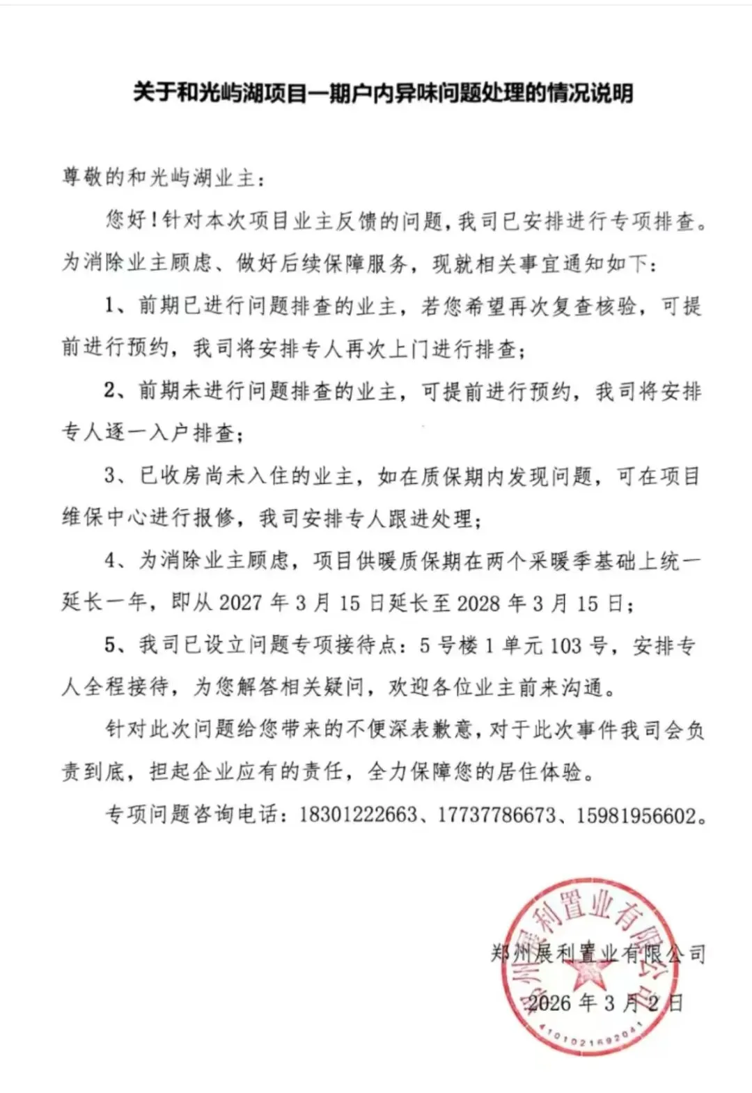 在该小区业主提供的加盖有开发商公章的《关乎和光屿湖项目一期户内异味问题处理的情况说明》上,记者看到,3月2日,开发商表示,针对此次问题给业主带来的不便深表歉意,对于此次事件该司会负责到底,担起企业应有的责任。