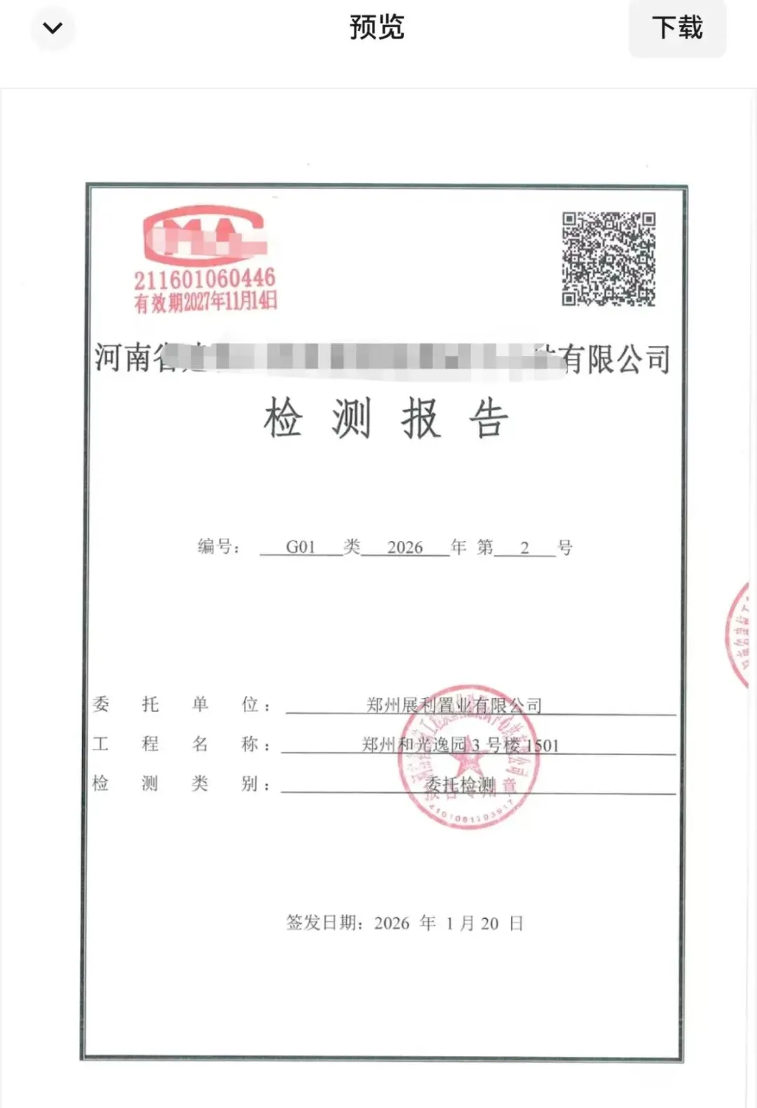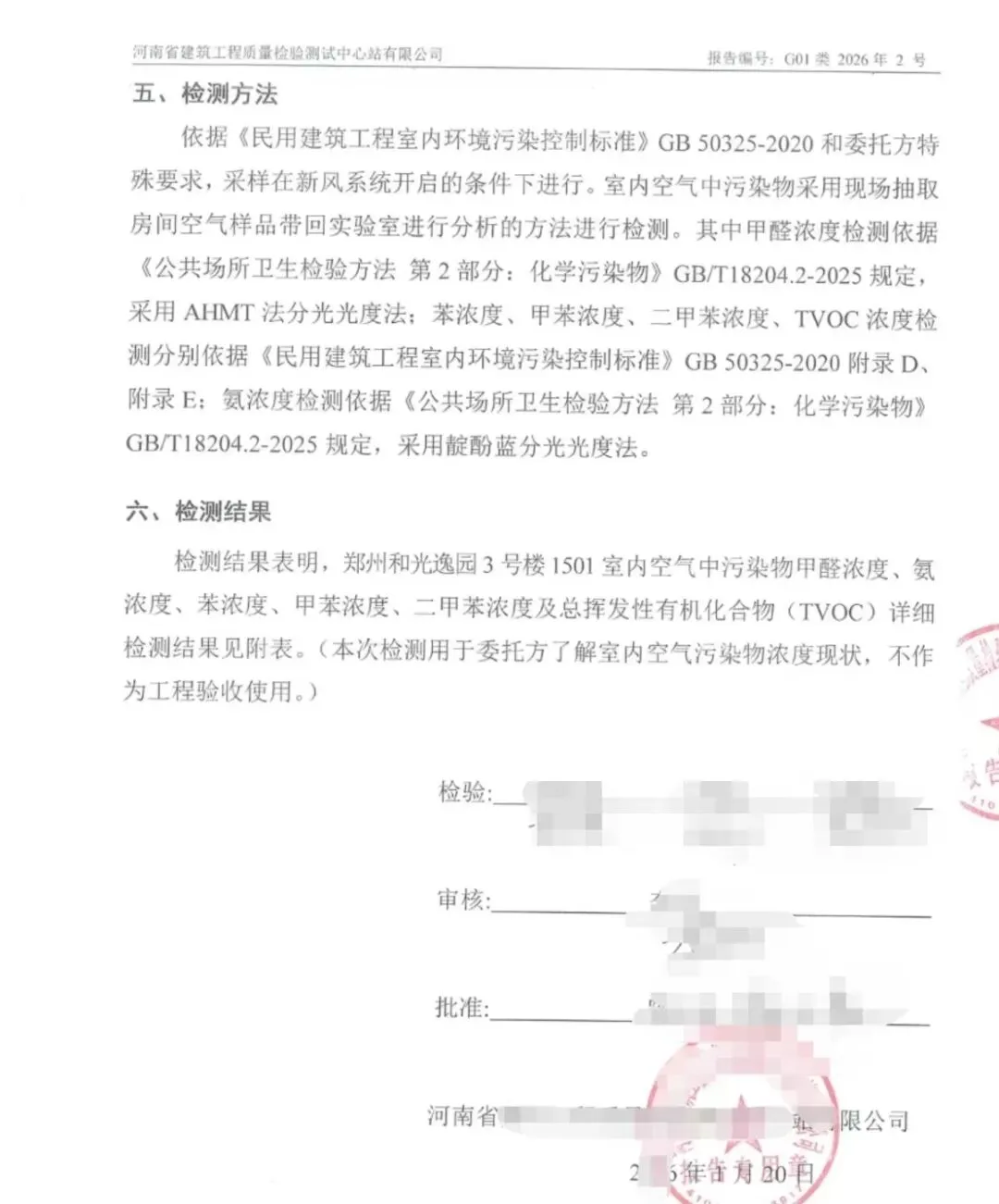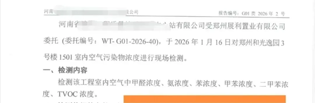 省内检测机构的报告显示,该机构于2026年1月16日当天,分别对该小区3号楼、7号楼等多户业主室内空气污染物浓度进行现场检测。