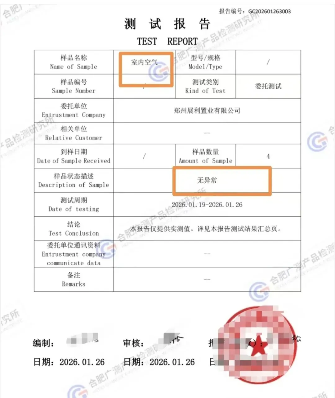 而省外那家检测机构的报告显示,检测的样品名称是“室内空气”,测试周期为2026年1月19日至2026年1月26日,样品状态描述为“无异常”。