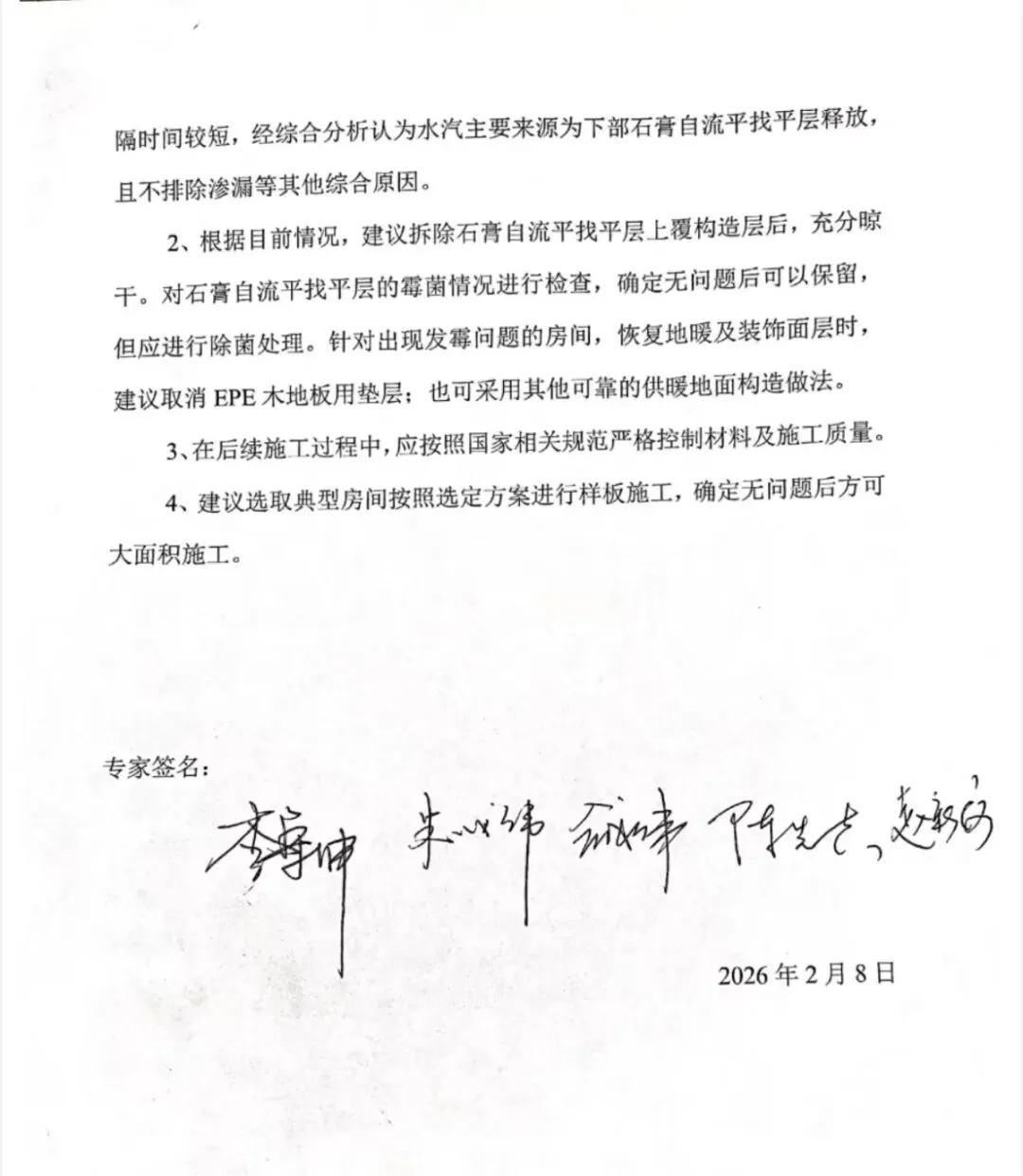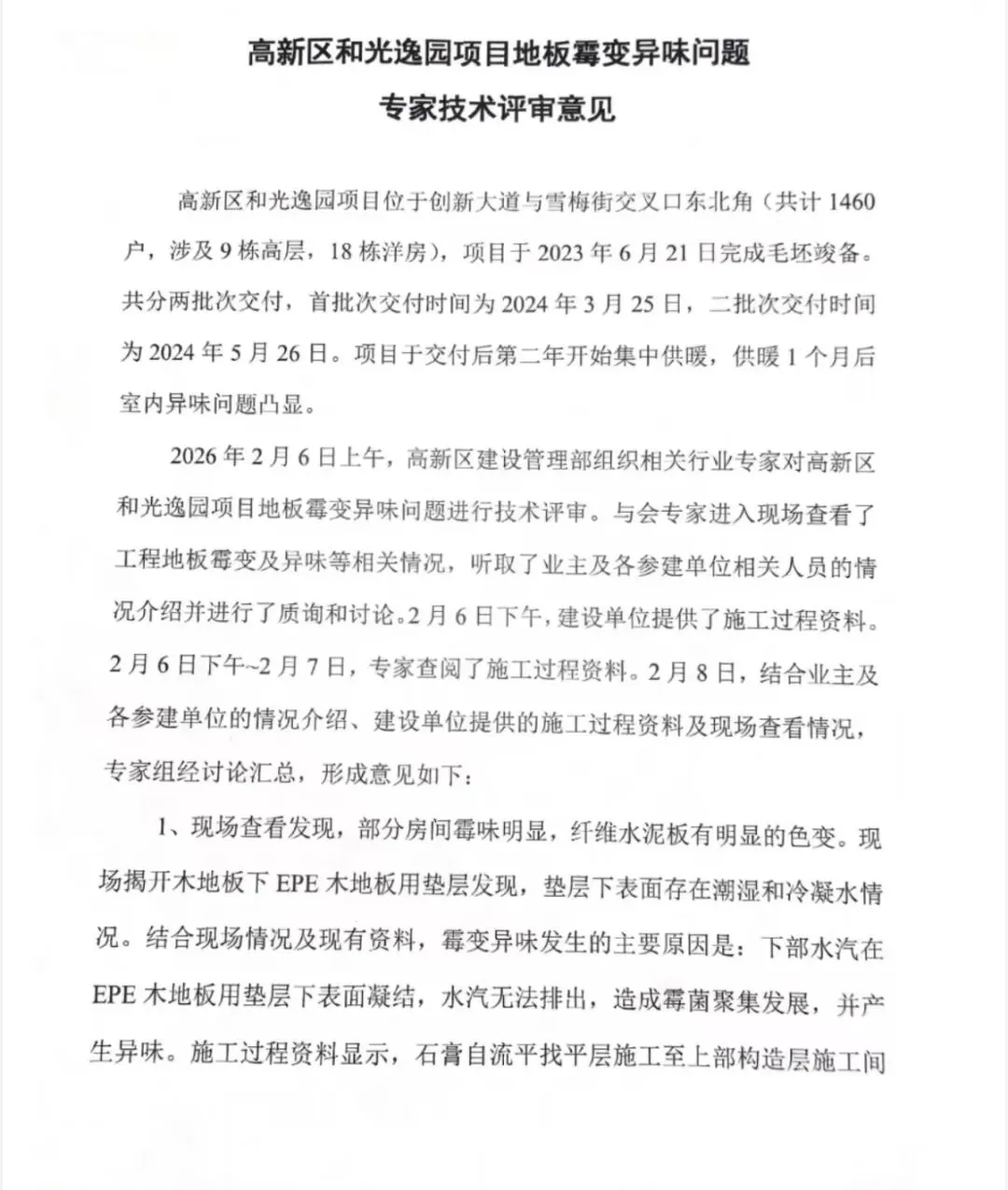 大河报记者了解到,2026年2月6日上午,郑州高新区建设管理部组织相关行业专家对高新区和光逸园项目地板霉变异味问题进行技术评审并出具一份由专家签名的《高新区和光逸园项目地板霉变异味问题专家技术评审意见》(如图,下称该《意见》)。此前,高新区建设管理部工作人员曾向媒体表示,相关部门已成立调查组,协调处理后续问题。