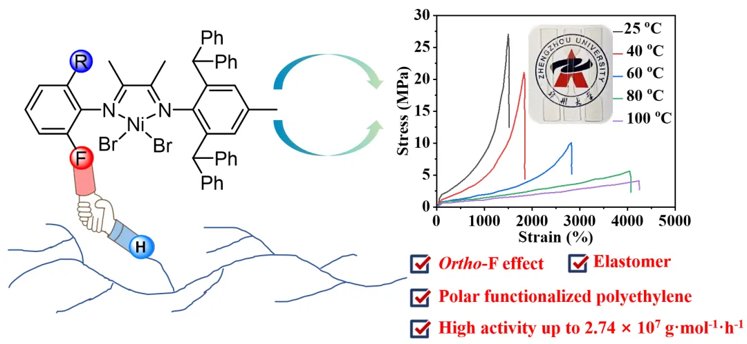 近年来,在催化剂设计中引入氟原子已成为一种有效的调控策略。然而,如何在单一催化体系中兼顾聚乙烯弹性体的高效合成与极性聚烯烃的可控制备,仍是当前亟需解决的关键难题。针对这一挑战,郑州大学姜辉/龚军芳教授团队近期设计并合成了一系列新型非对称α-二亚胺镍(II)配合物(图1)。通过系统的催化性能评估与聚合物结构解析,研究团队深入探讨了位阻效应与氟效应在催化活性、聚合物分子量及极性单体共聚插入率等方面的协同调控机制。研究结果表明,N-芳环邻位的位阻基团与氟取代之间存在显著的协同作用:一方面促进了高分子量聚乙烯弹性体的形成,另一方面有效提升了乙烯与极性单体的共聚效率,实现了两类关键性能的同步优化。该工作不仅为深入理解α-二亚胺镍催化剂的结构—性能关系提供了重要实验依据,也为新一代高性能聚乙烯弹性体及极性聚烯烃材料的分子设计与开发奠定了坚实基础。