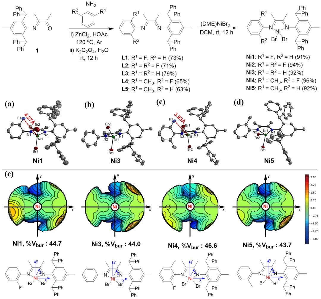 催化剂的合成路线如图2所示。首先,参照文献方法高效合成关键中间体——化合物1。随后,化合物1与一系列含有不同取代基的苯胺衍生物发生缩合反应,以63%–79%的产率成功制得目标α-二亚胺配体L1–L5。最后,将所得配体L1–L5与(DME)NiBr₂(DME = 1,2-二甲氧基乙烷)进行配位反应,以91%–96%的高产率得到相应的镍配合物Ni1–Ni5。采用核磁共振氢谱、碳谱及氟谱、元素分析、X-射线单晶衍射以及包埋体积计算等方法对所有镍配合物的结构进行了系统表征与验证。