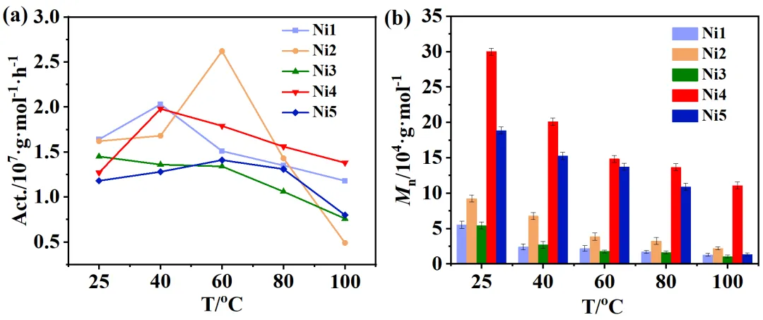 图3. Ni1-Ni5在25-100 ℃下进行乙烯均聚(a)催化活性、(b)分子量的对比图(图片来源:Polym. Sci. Technol)