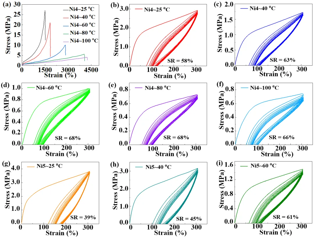 图4.(a)聚合物的应力-应变曲线;(b-i)聚合物样品在300%应变下10次循环的迟滞实验图(图片来源:Polym. Sci. Technol)