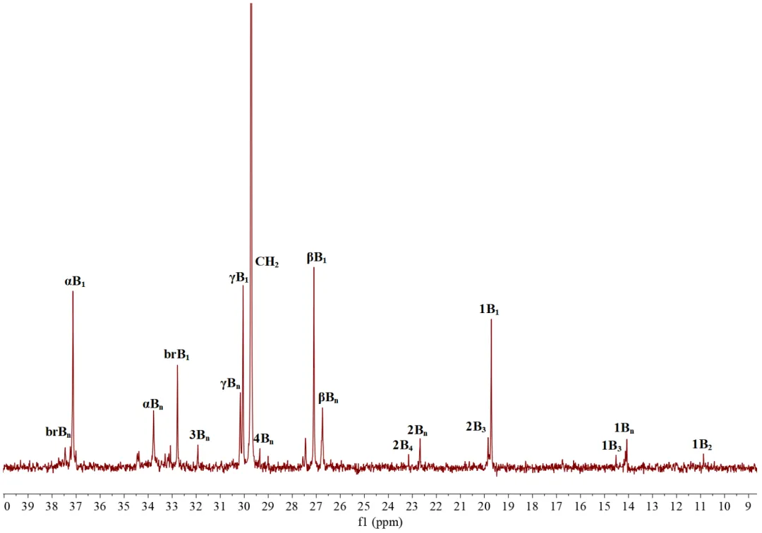 图5. 25 ℃下Ni4制备的聚乙烯弹性体的¹³C NMR(图片来源:Polym. Sci. Technol)