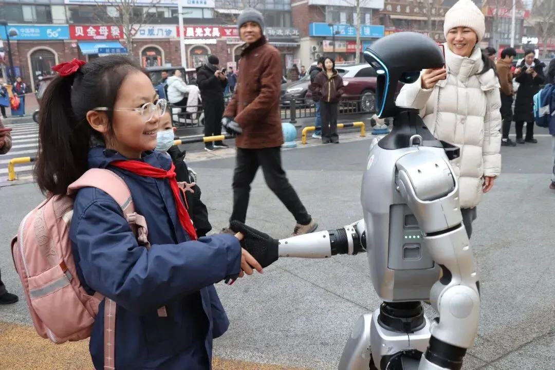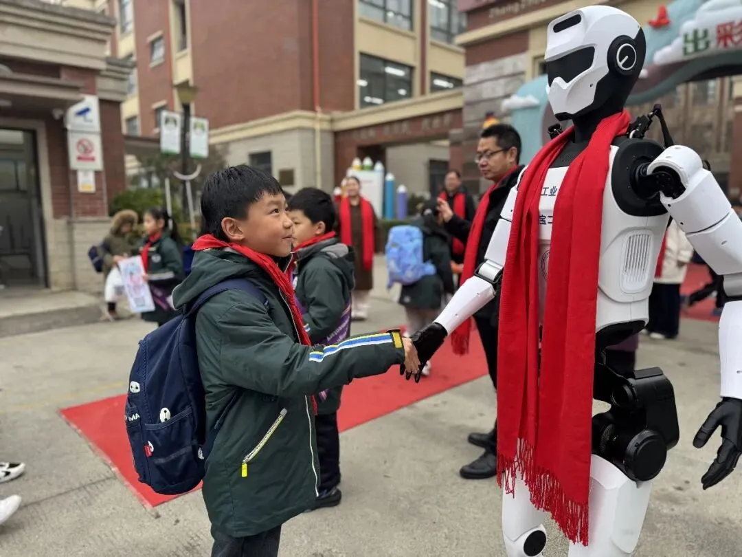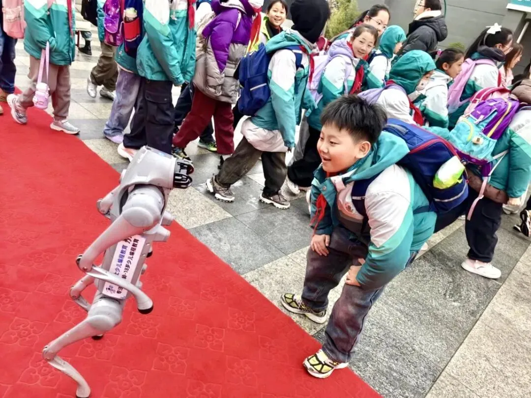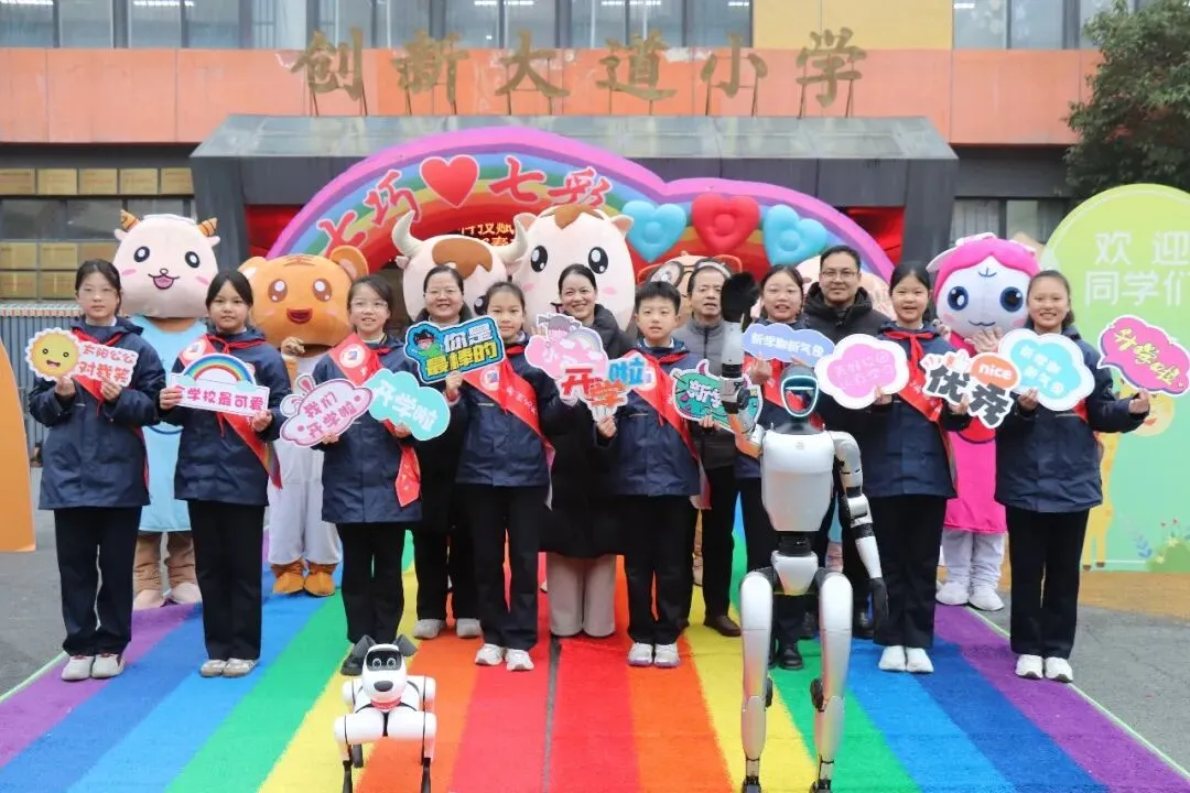 创新大道小学迎来新学期开学第一天,校园以七巧文化为底色,用智能机器人热情迎接学子归来。