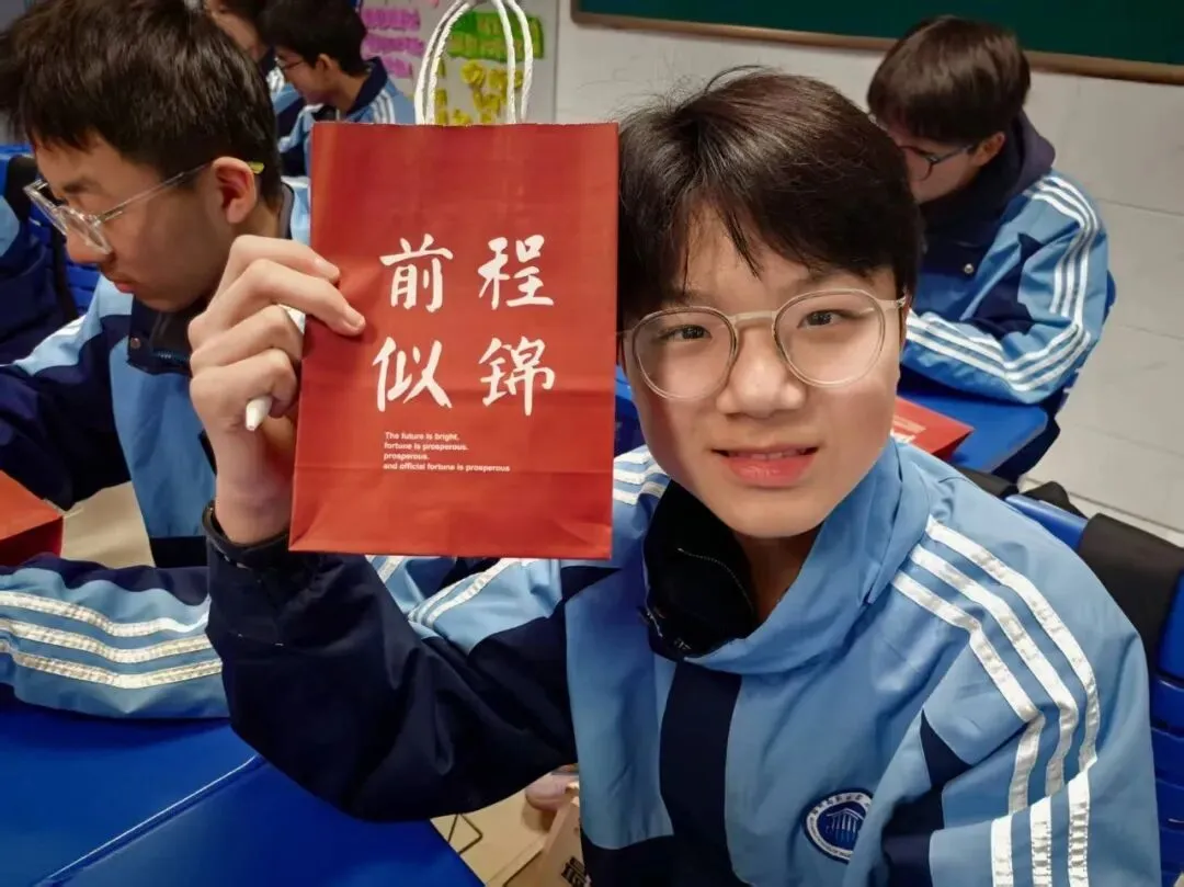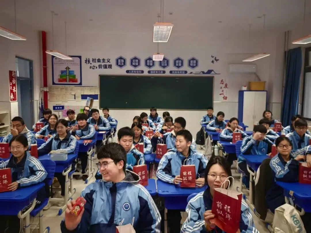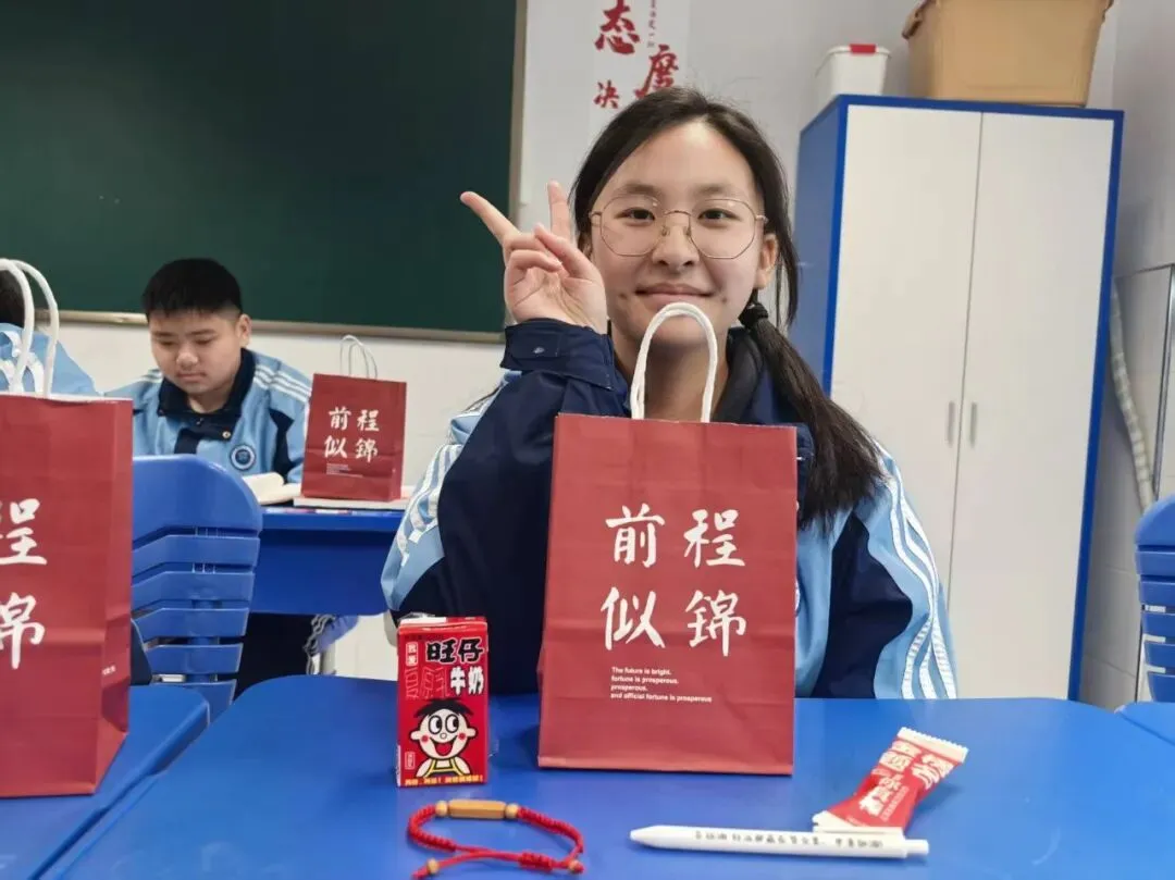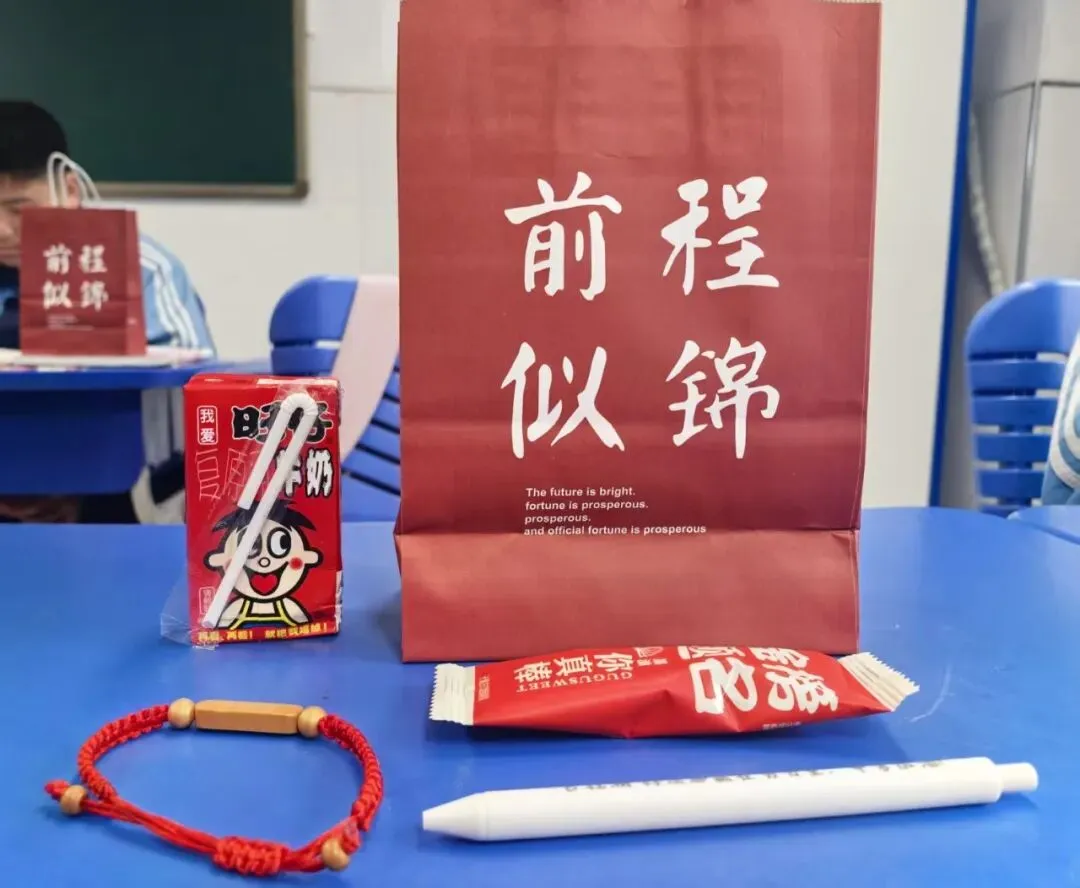 定制中考加油礼包成为最亮眼的特色:从刻着姓名的红绳手链,到写满鼓励的文具零食,每一件都承载着学校与老师的期许。