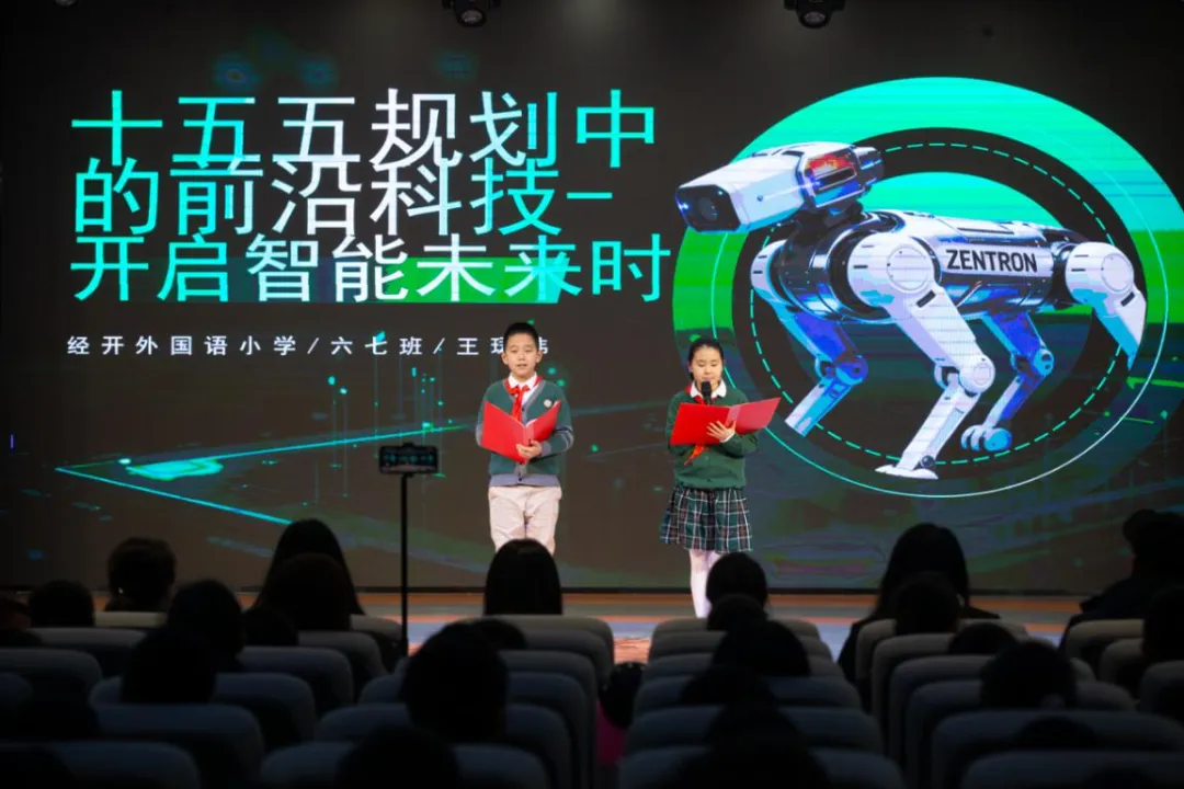 郑州经开区外国语小学以“科技”为主题开启新学期。升旗仪式后,灵敏的机器狗、精彩的科技秀表演让孩子们惊叹连连,一项项十五五规划中的前沿科技,在孩子们心中种下“科技强国梦”的种子。