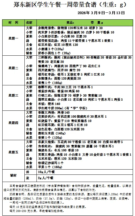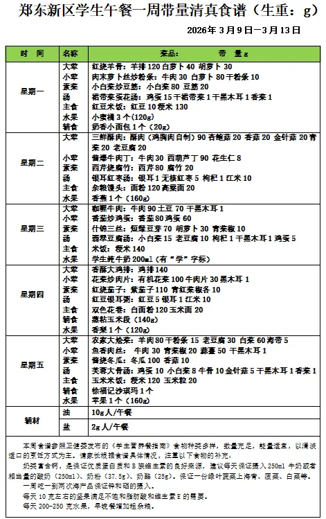 >郑州市郑东新区畅和街小学午餐一周(3月9日——3月13日)食谱
