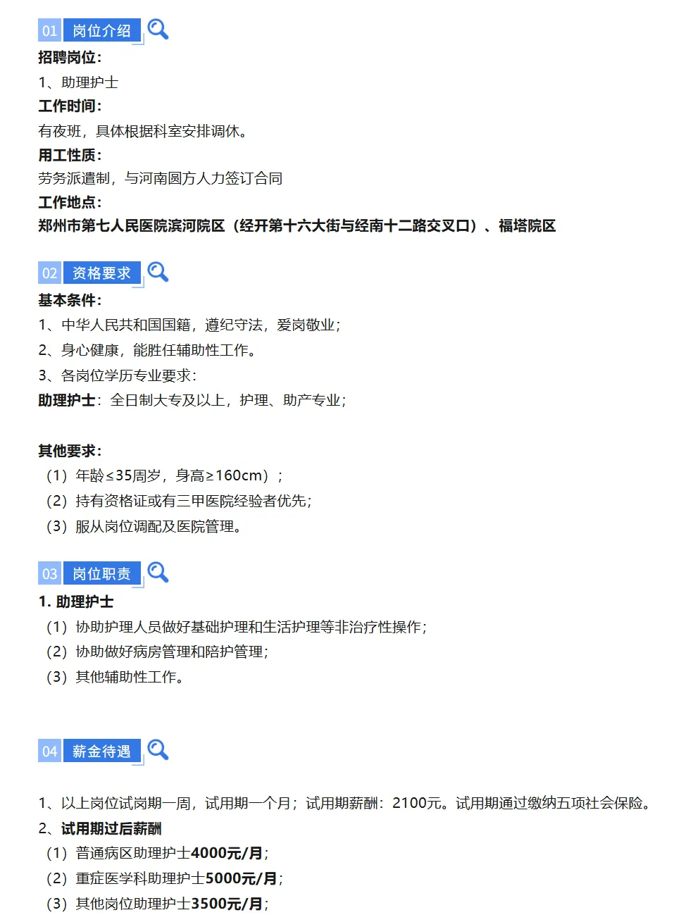 >郑州某三甲医院福塔院区、滨河院区招聘助理护士 实发4000到5000+