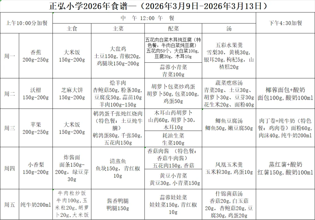 郑州高新区外国语小学营养午餐食谱(3月9日—3月13日)