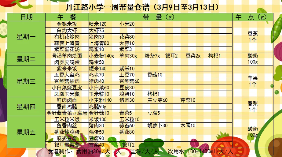 郑州市上街区丹江路小学一周食谱(2026年3月9日-3月13日)