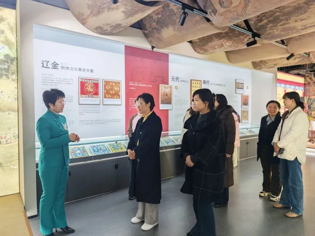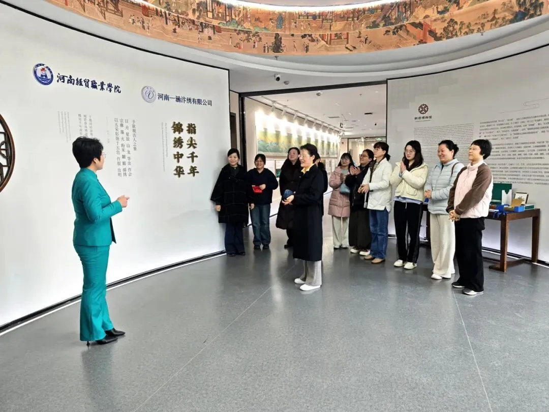 活动首站,一行人走进充满艺术气息的“河南经贸·一涵刺绣博物馆”。这座博物馆由一涵汴绣与河南经贸职业学院携手共建,不仅是全国首个以刺绣非物质文化遗产为主题的产教融合机构,也是河南省内首家聚焦刺绣非遗文化的专题性场馆,集展示、教育、交流、创新于一体。博物馆占地1600平方米,系统呈现了中国刺绣技艺的千年脉络与地域特色,收藏着横跨古今的刺绣珍品,每一件藏品都诠释着“择一事终一生”的执着专注。