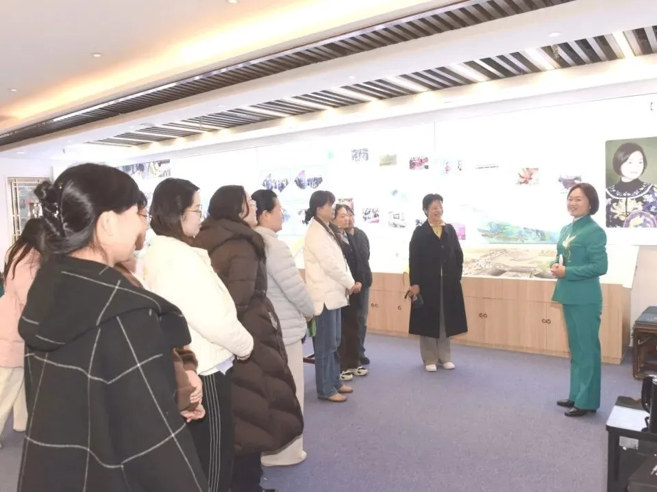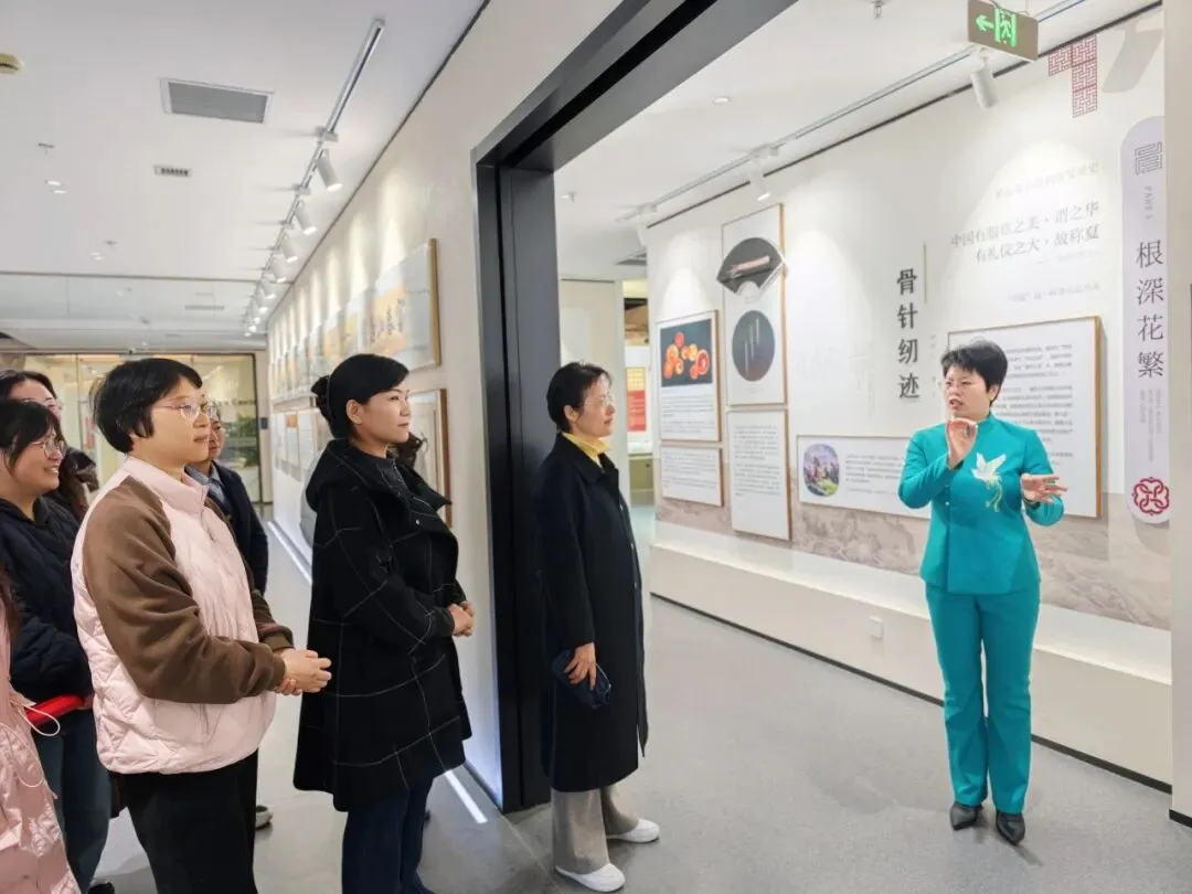 随后,活动队伍移步至一涵汴绣展厅,董事长张留凤亲自接待并担纲讲解。作为全国三八红旗手、汴绣非遗传承人,董事长张留凤本身就是“巾帼力量”的生动写照。在展厅柔和的灯光下,董事长张留凤结合自身四十余年的守艺经历,为大家讲述每一幅作品背后的创作故事与文化情怀。从家庭式作坊到手工汴绣行业代表性企业,从带领数百名绣娘实现“指尖增收”到刺绣作品远销海内外,其讲述让在场的女同胞们深受触动。